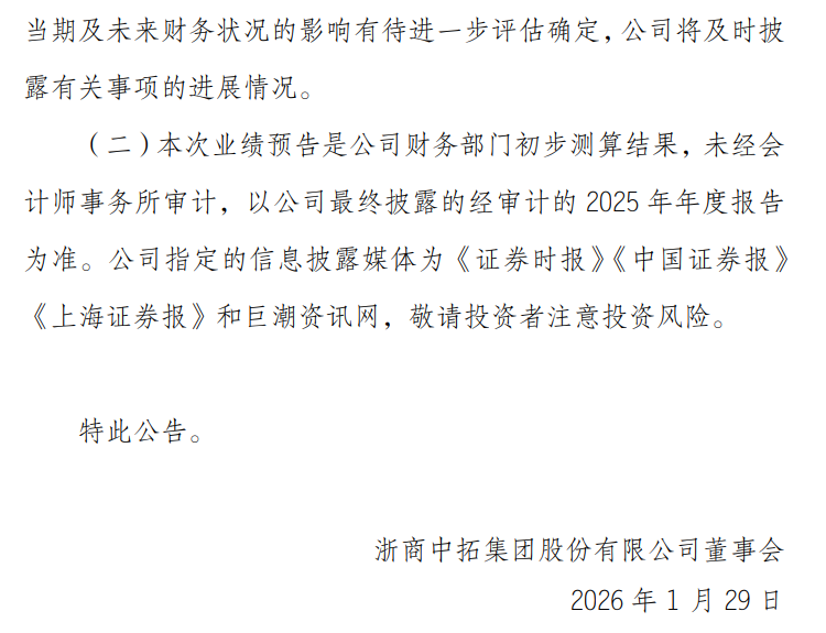 1月29日,浙商中拓发布2025年度业绩预告称,报告期内,公司预计实现归属于上市公司股东的净利润1.65亿元至2.30亿元,同比下降37.64%至55.27%;扣除非经常性损益后的净利润预计亏损1.50亿元至2.15亿元,亏损同比扩大。