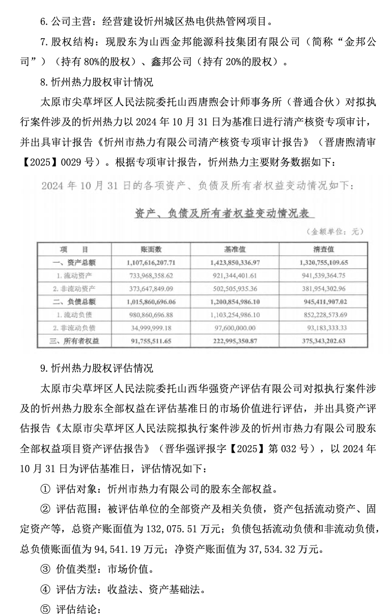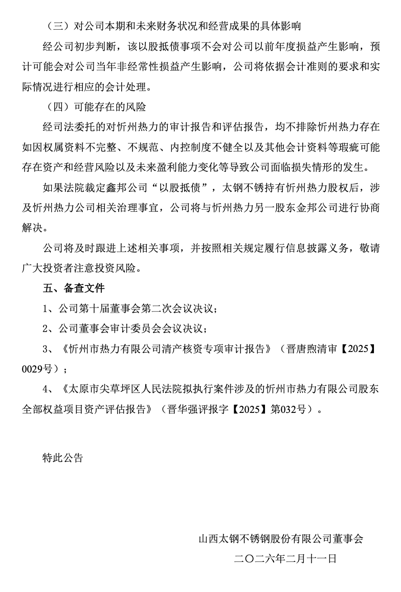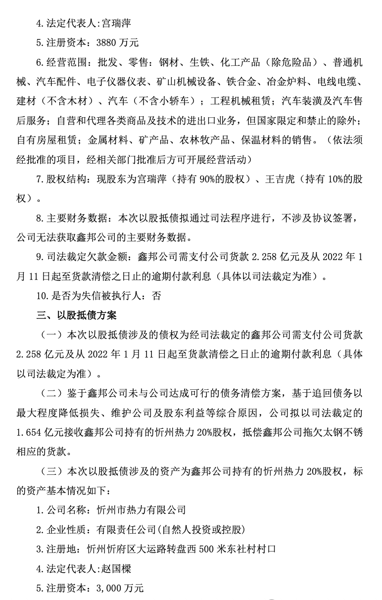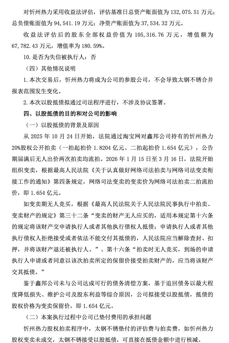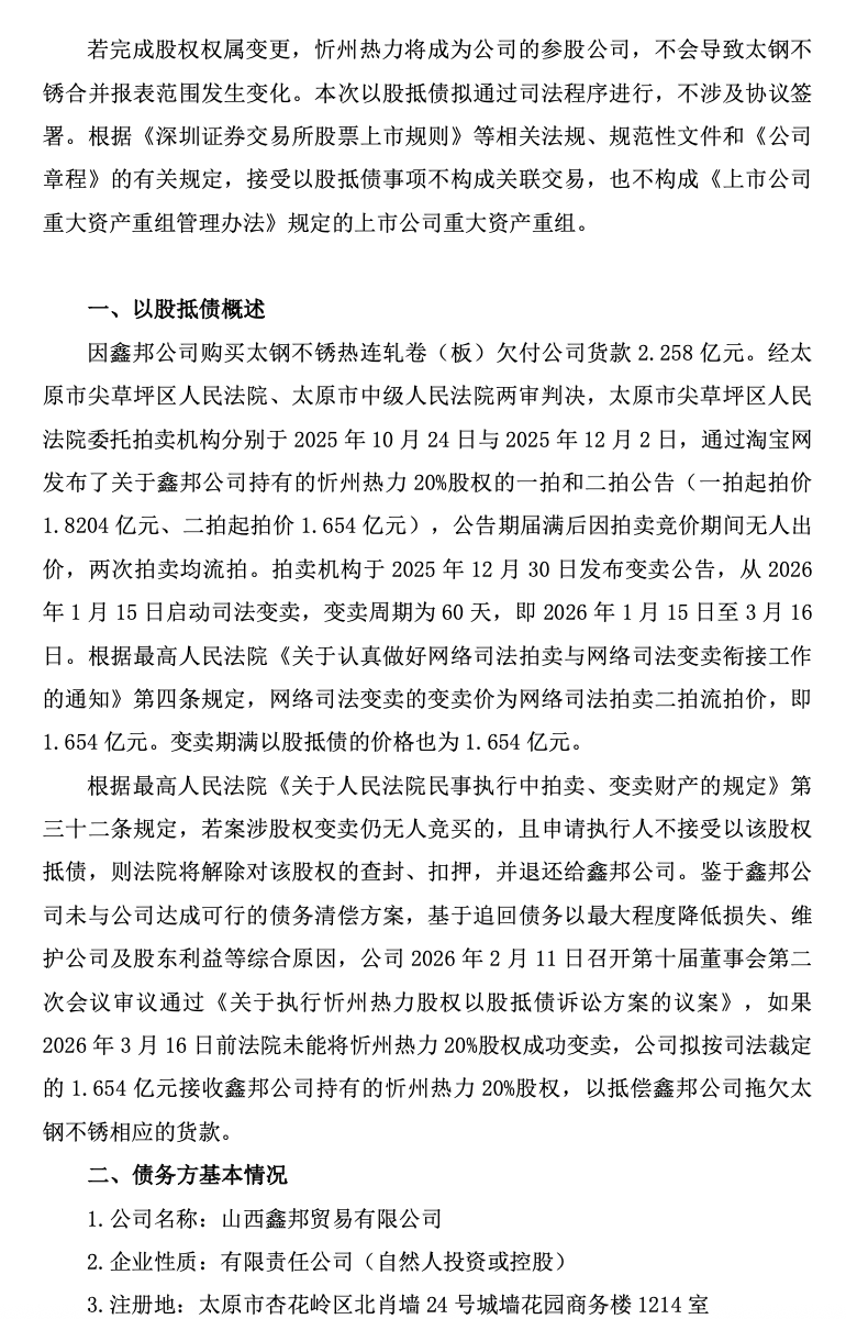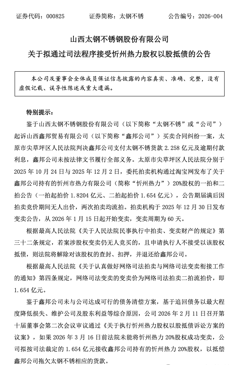 日前,太钢不锈发布公告称,公司起诉鑫邦公司买卖合同纠纷一案,法院判决鑫邦公司支付货款2.258亿元及逾期付款利息。由于鑫邦公司未按法律文书履行全部义务,法院委托拍卖机构进行拍卖,但两次拍卖均流拍。公司拟按司法裁定的1.654亿元接收鑫邦公司持有的忻州热力20%股权,以抵偿鑫邦公司拖欠的货款。若完成股权权属变更,忻州热力将成为公司的参股公司,不会导致太钢不锈合并报表范围发生变化。