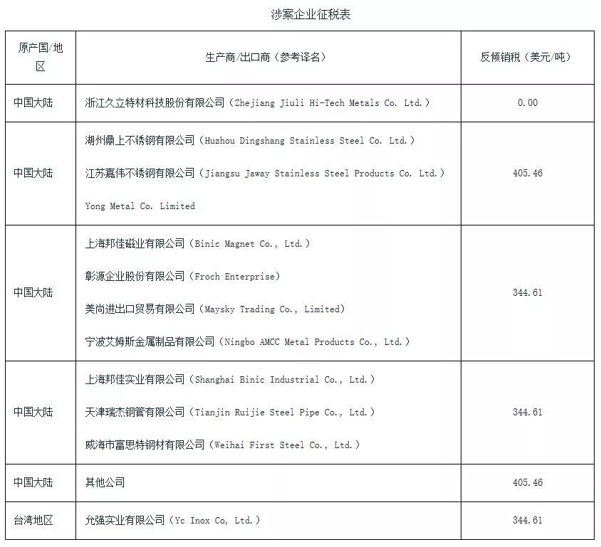 据中国贸易救济信息网消息,近日,巴西经济部发布第506号法令,对原产于中国大陆和台湾地区的奥氏体不锈钢圆形焊管(葡语:tubos com costura, de açosinoxidáveis austeníticos graus 304 e 316,de seção circular)作出第一次反倾销日落复审终裁:1. 继续对中国大陆涉案产品征收为期5年的反倾销税;2. 终止对台湾地区涉案产品的调查,不建议继续延长对台湾地区进口产品征收反倾销税(除允强实业有限公司(Yc Inox Co, Ltd.)之外),具体税额见下表(涉案企业征税表)。涉案产品的南共市税号为7306.40.00和7306.90.20。
