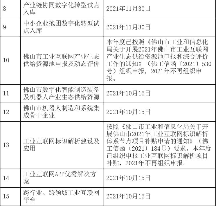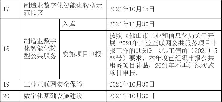 为贯彻落实《佛山市人民政府关于印发佛山市推进制造业数字化智能化转型发展若干措施的通知》(佛府〔2021〕12号)(下称“《若干措施》”),加快我市制造业数字化、网络化、智能化转型发展,根据《佛山市推进制造业数字化智能化转型发展若干措施操作细则》(佛工信〔2021〕4号)要求,我局组织开展2021年佛山市推进制造业数字化智能化转型发展扶持资金项目申报工作,有关事项通知如下: