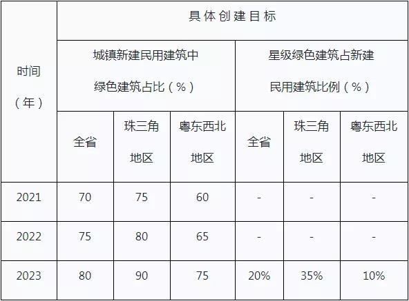 到2021年,基本建立与《条例》相配套的政策文件体系和绿色建筑全寿命期监管体制机制;全面推进新建民用建筑按照绿色建筑标准进行建设,2021至2023年我省城镇新建民用建筑中绿色建筑占比分别达到70%、75%、80%;星级绿色建筑面积持续增加,到2023年,全省按一星级及以上标准建设的绿色建筑占新建民用建筑比例达到20%,其中粤港澳大湾区珠三角九市比例达到35%。全省建筑健康性能显著增强,装配式建造方式占比稳步提高,建筑能效水平不断提升,既有建筑绿色化改造、可再生能源建筑应用和绿色建材应用的规模进一步扩大。具体创建目标如下: