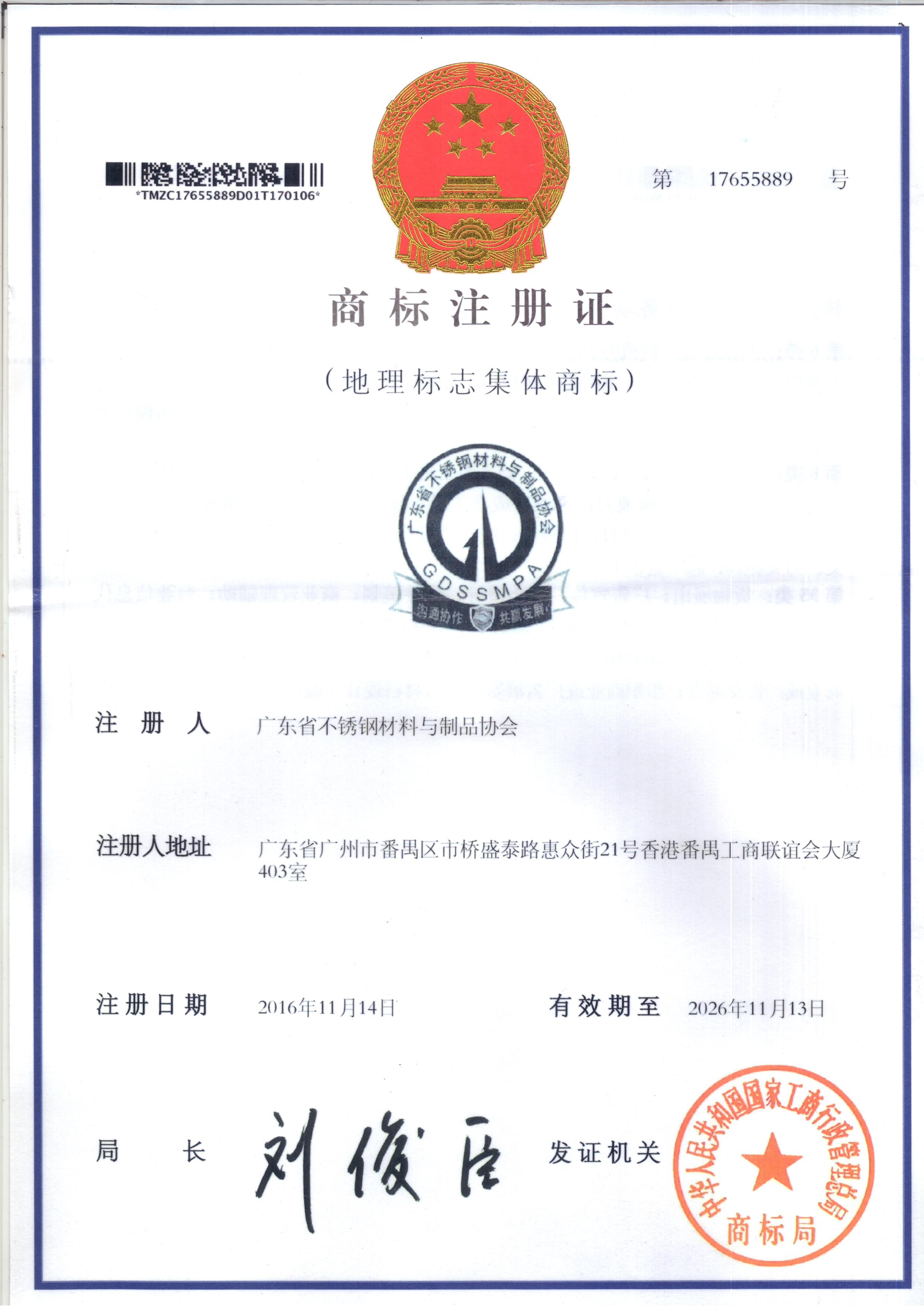 为更好的树立我会品牌形象,为会员单位有效开展服务,为进一步打造和擦亮广东不锈钢区域品牌提供必要支持,2013年12月28日我会成立后第一时间把申报协会集体商标作为一项重点工作进行推进。2014年2月,相关申报工作正式展开,2014年和2015年先后两次向国家工商总局商标局提交了注册申请,在耗时两年半后终获审核并成功注册。