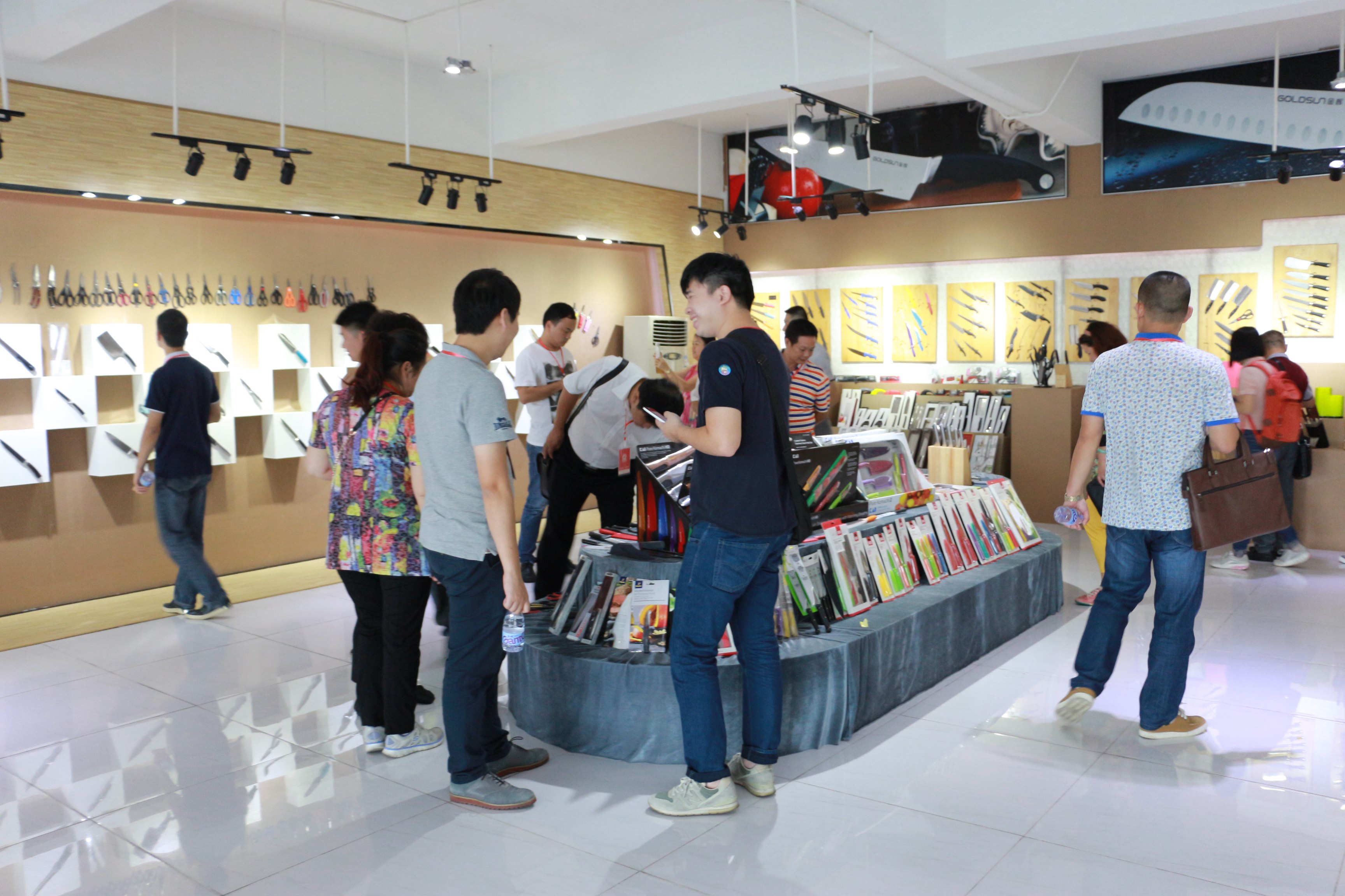 金辉公司的产品检测实验室里各种先进的检测设备与产品展厅里各式各样锋利无比的刀剪陈列其中,大家饶有兴趣的观摩体验,当了解到有三把刀的套装在国外销售价格达6000多元人民币时,一行人对该公司刀剪产品追求较高附加值与发挥品牌力量予以称赞。