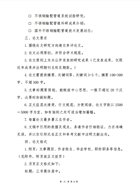 为进一步发挥协会和会议交流合作平台作用以及沟通国内产学研用联合攻关渠道作用,跟踪学习国内国际先进技术,加快解决不锈钢材料在推广应用中的难题,增强企业自主创新能力,推动行业健康发展,助力建设优质饮用水工程,提高人民群众对幸福生活的获得感,特向各有关单位技术开发、生产管理和应用领域的工程、技术人员等征集不锈钢管道管件及相关配套在应用推广、性能改善、安装维护、加工制造等方面的技术论文。