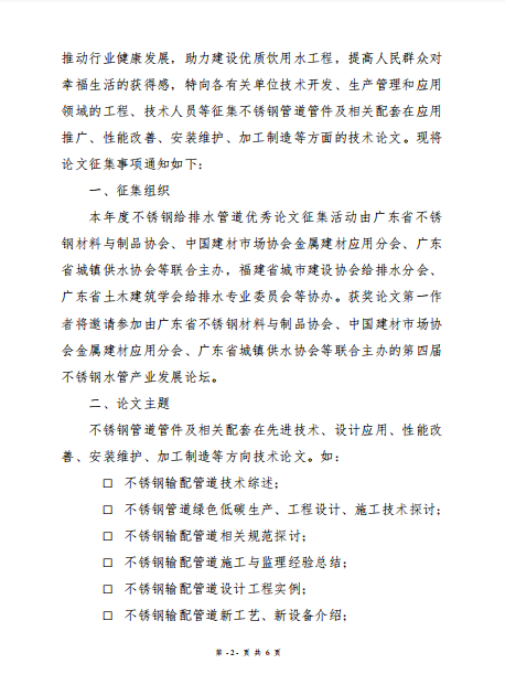 关于开展不锈钢给排水管道优秀论文征集活动的预通知