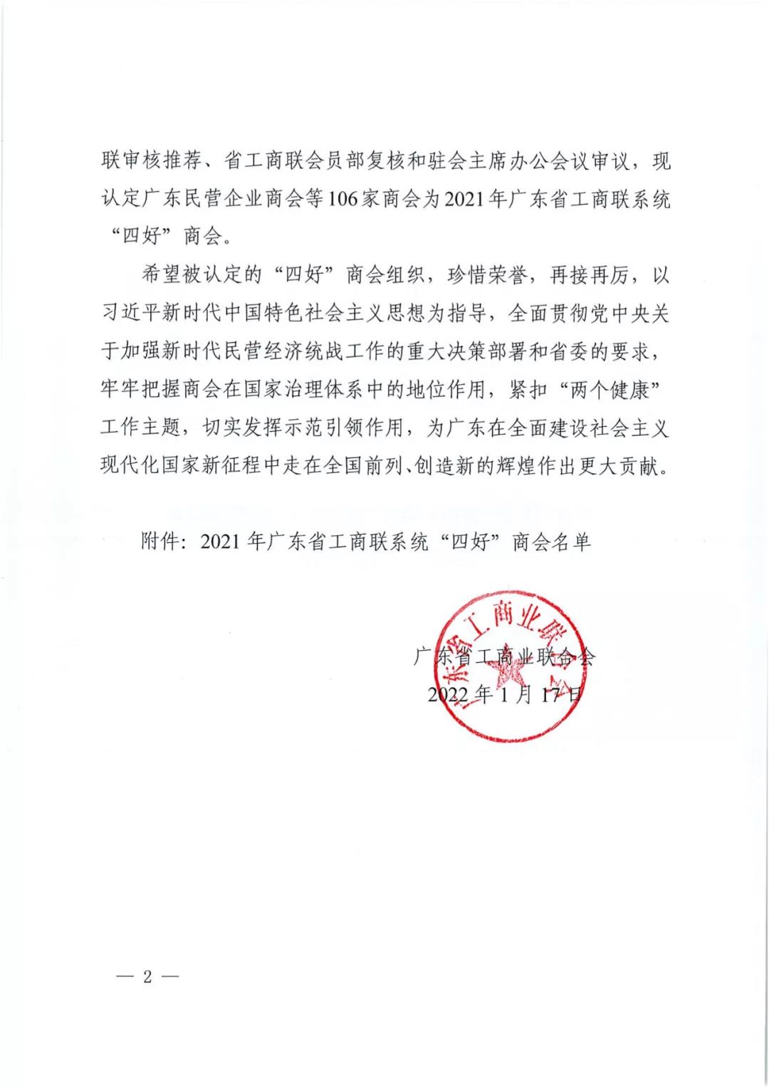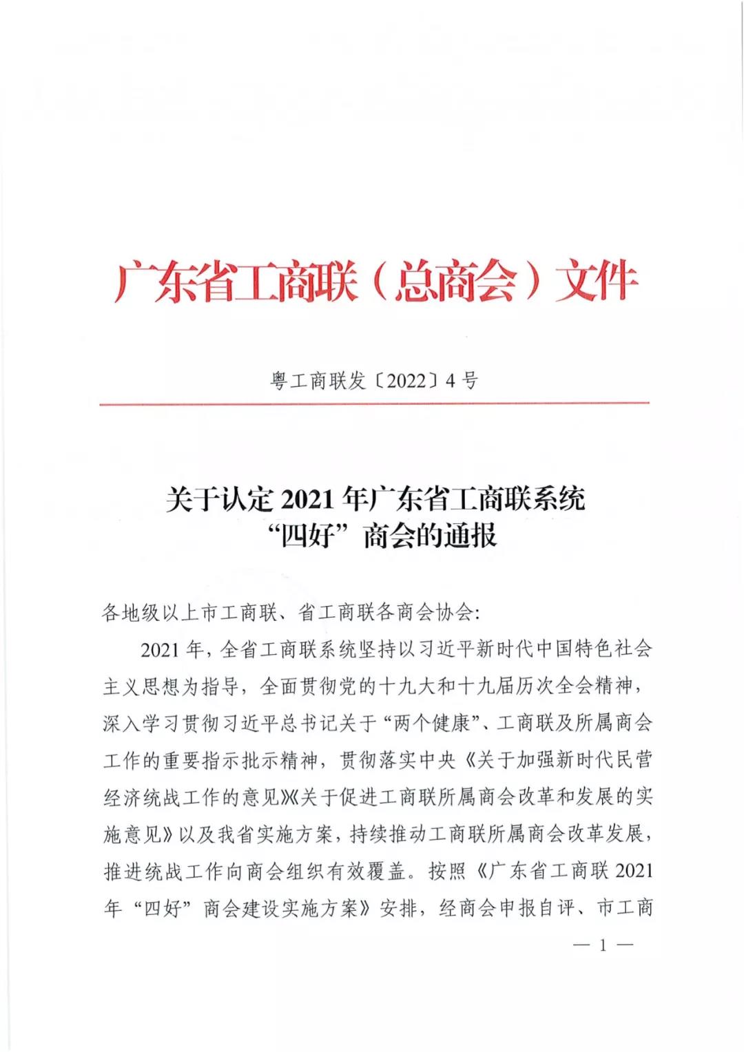 祝贺我会荣获2021年广东省工商联“四好”商会荣誉称号
