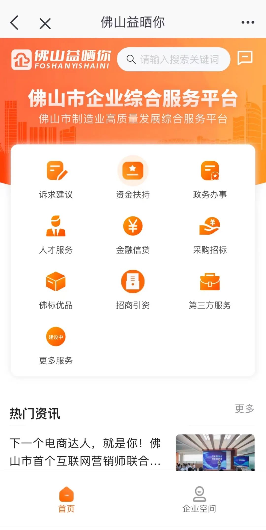 可通过“佛山通”小程序或APP--“企业服务”界面进入“佛山益企通”,也可通过“粤商通”APP登陆。企业即可享爱“诉求建议、政务办事、资金扶持、金融信贷、人才服务、佛标优品等随身服务。