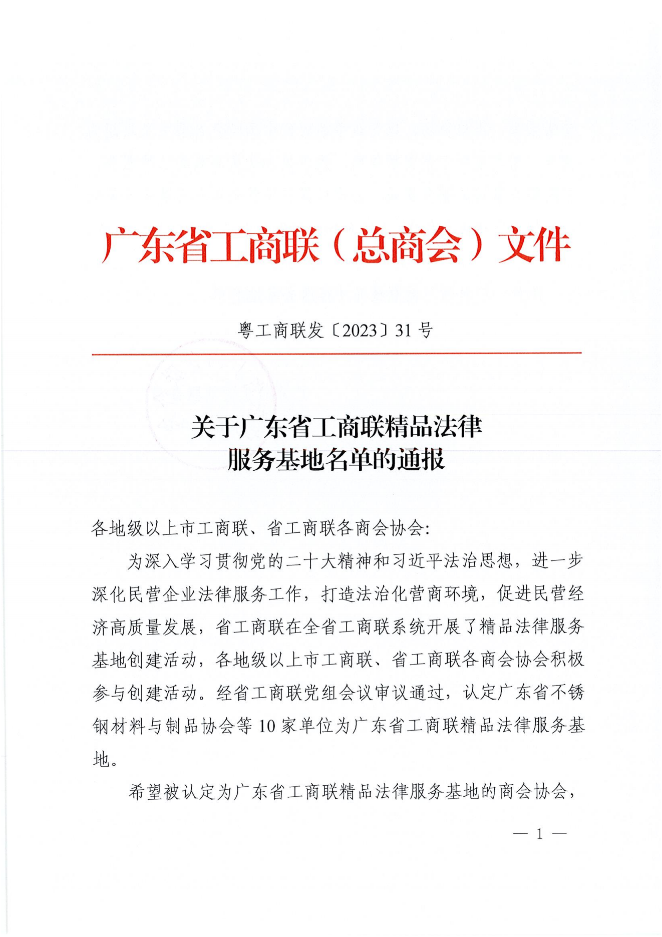 6月9日,广东省工商联印发了《关于广东省 工商联精品法律服务基地名单的通报》(粤工商联发〔2023〕31号)。经省工商联党组会议审议通过,认定广东省不锈 钢 材 料 与 制 品 协 会 等 1 0 家 单 位 为广 东 省 工商 联 精 品 法 律 服 务 基地。这是我会继荣获“广东省工商联法律服务示范点”后的又一荣誉,充分体现了省工商联对我会相关工作的高度认可和鼓励。