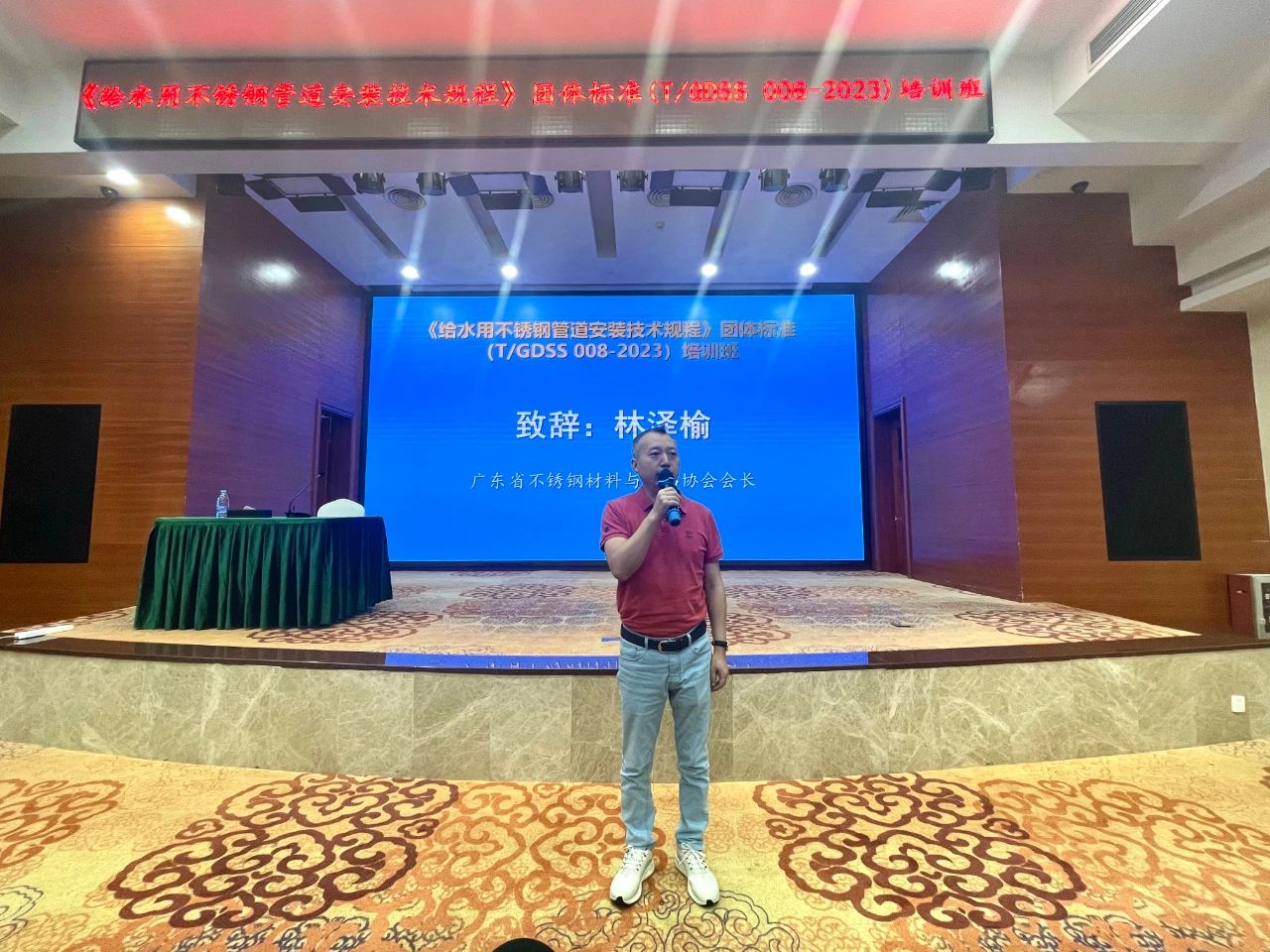 为进一步推动标准落地,提升我省供水质量和给水用不锈钢管道安装技能水平,规范安装施工,减少不锈钢管道工程问题,更好促进不锈钢管道的推广应用和行业高质量发展,8月11日,广东省不锈钢材料与制品协会(下称省不锈钢协会)联合广东省城镇供水协会(下称省水协)在广州金城宾馆举办《给水用不锈钢管道安装技术规程》团体标准(T/GDSS 008-2023)宣贯培训班。省不锈钢协会执行会长林泽榆、秘书长黄耿燕,省水协秘书长潘景盛,省不锈钢协会管道安装特聘专家燕晓林、深圳民乐技术总监徐志华等出席培训班,来自全省水司共130名多技术、安装人员参加培训,培训班由省水协潘景盛秘书长主持。