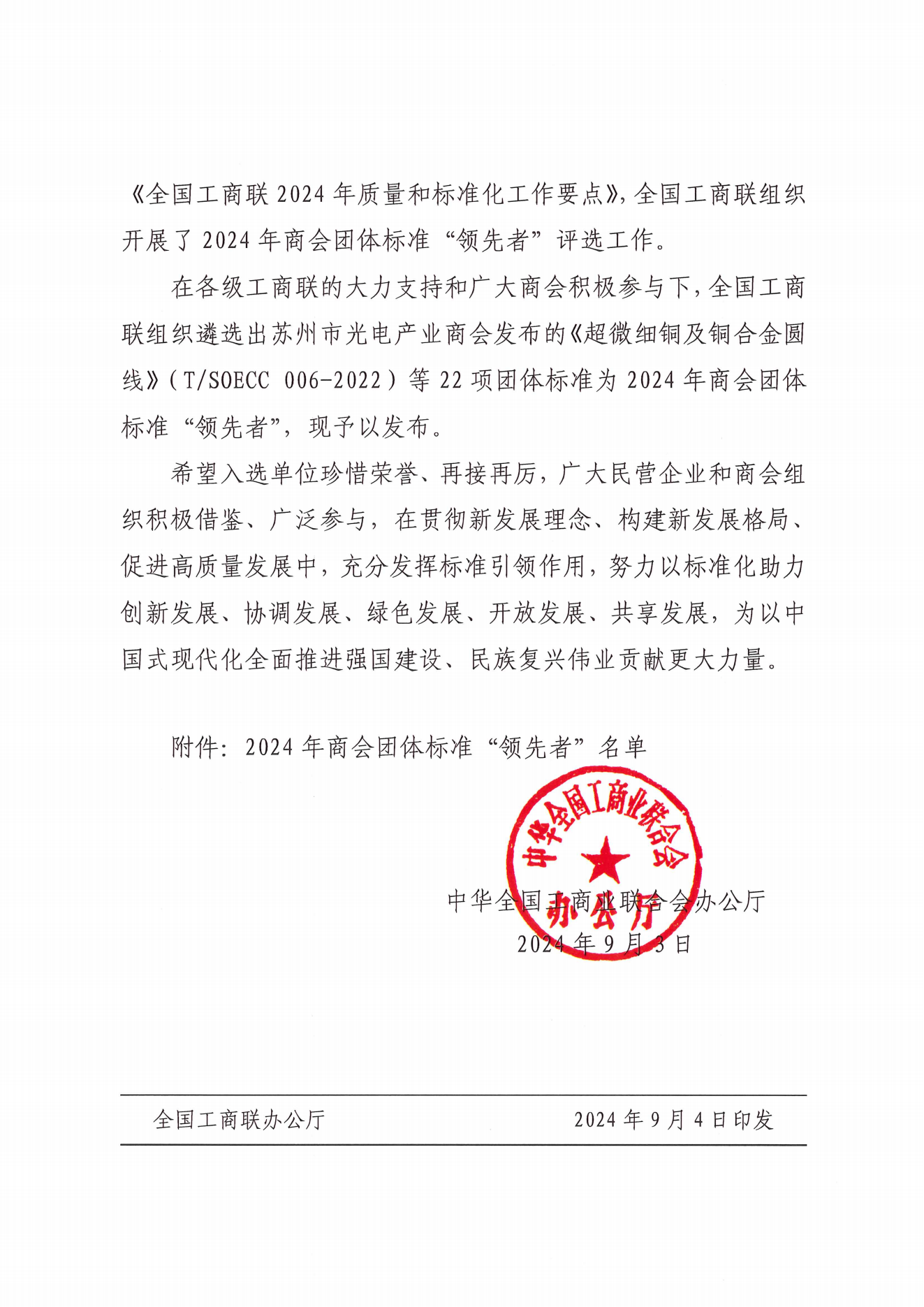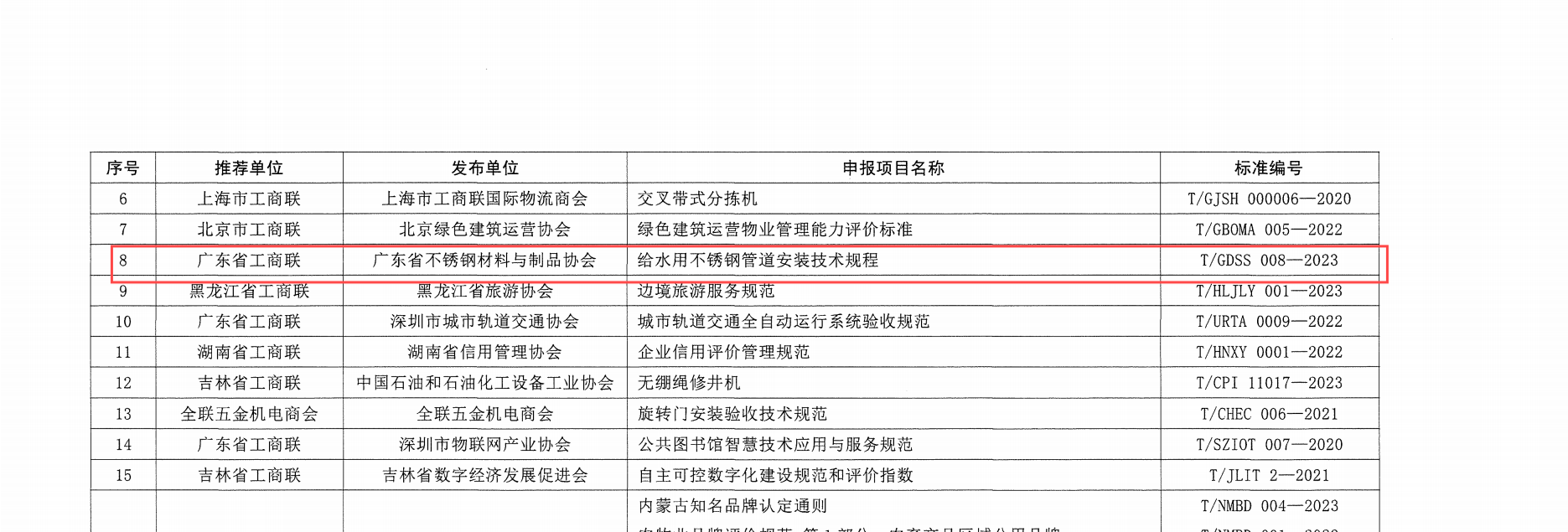 9月3日,全国工商联办公厅发布了《关于2024年商会团体标准“领先者”名单的通知》(全联厅发〔2024〕39号文),由广东省工商联推荐、广东省不锈钢材料与制品协会编制的《给水用不锈钢管安装技术规程》团体标准成功入选。这是我会继佛山市团体标准试点成功验收后获得的新荣誉,是对我会积极探索团体标准工作的肯定与鼓励。