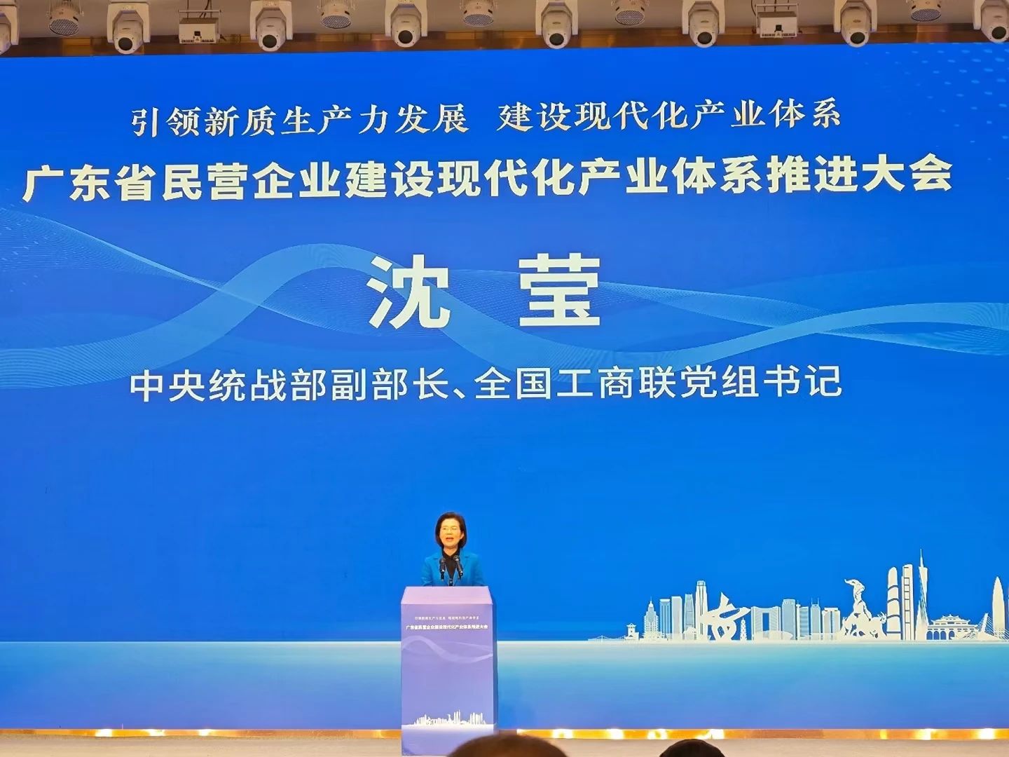 沈莹同志在讲话中表示,建设现代化产业体系前景广阔、大有可为,民营企业要把住重点、多作贡献。要坚守主业、做强实业,共同筑牢现代化产业体系的坚实基础;要向“新”而行、以“质”致远,大力发展新质生产力,坚持深化改革、创新管理,按照中国特色现代企业制度要求提升治理水平。作为党和政府联系民营企业的桥梁和纽带,各级工商联要发挥好作用,用心用情做好服务,推动党和国家各项政策落地落实,支持民营企业发展新质生产力,建设现代化产业体系。全国工商联将一如既往地关注广东、支持广东,祝愿广东早日建成具有国际竞争力的现代化产业体系,祝愿广大的广东民营企业再创辉煌,为推进中国式现代化作出更大贡献。