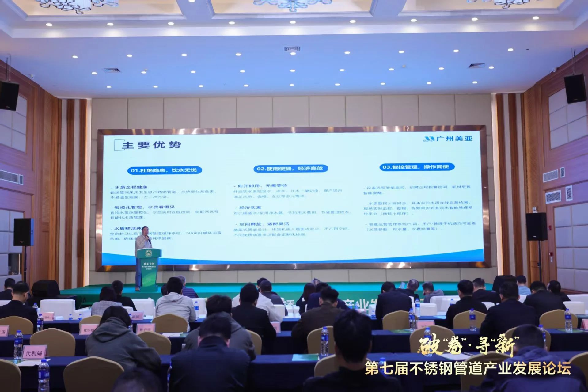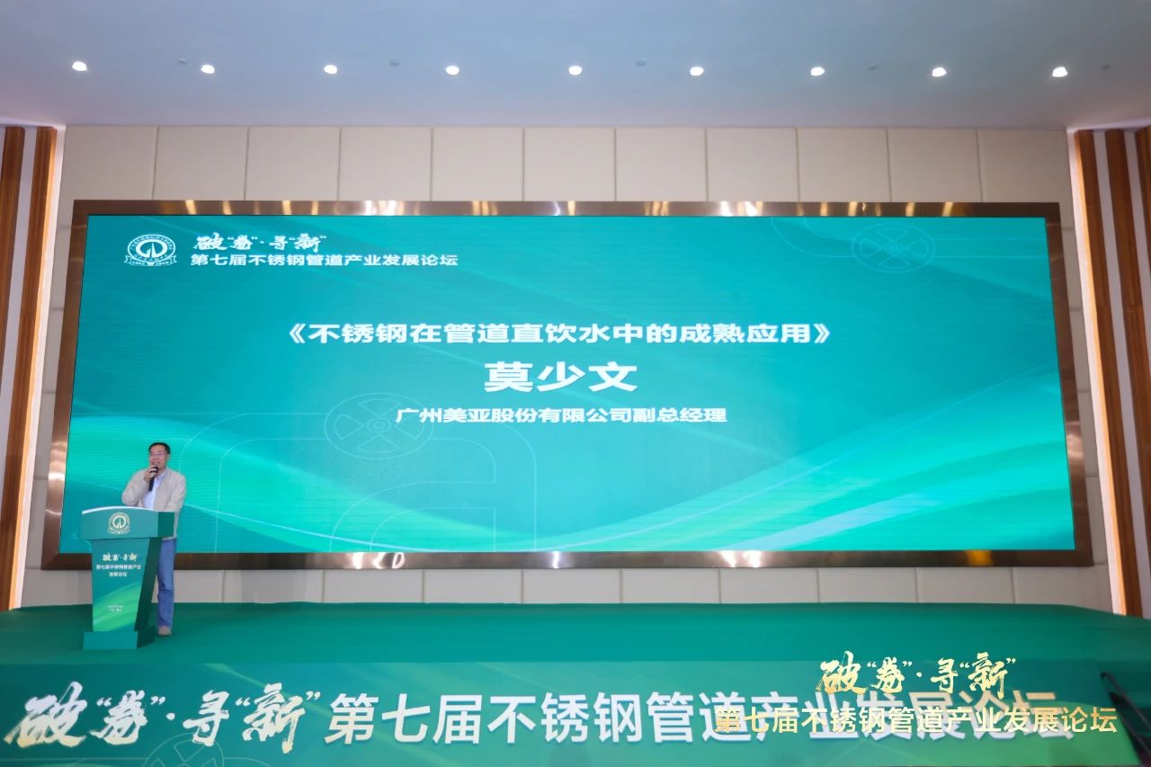 广州美亚副总经理莫少文在《管道直饮水及不锈钢水管的应用》主题分享中,对直饮水系统作了介绍,并从政府的政策支持、行业规范及行业趋势多方面说明了不锈钢水管在管道直饮水应用中发挥着举足轻重的作用,同时通过美亚多个成功案例展现了不锈钢管道的广泛应用。