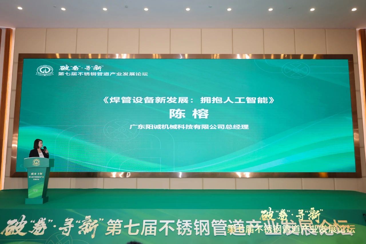 广东阳诚陈榕总经理作《智能驱动未来-焊管设备的AI与自动化》报告。陈总结合自身的观察和企业优势总结了现有不锈钢焊管行业的一些痛点,认为设备智能化转型是必然也是必要的,未来发展趋势将是更简单、更智能、更高效,并对其第五代全自动焊管机做了全面介绍,展示了国内外多个客户的成功应用案例。