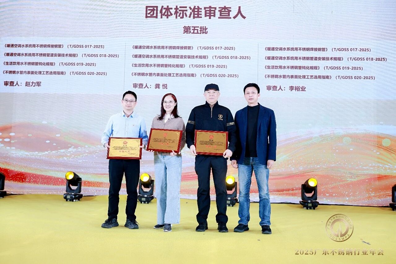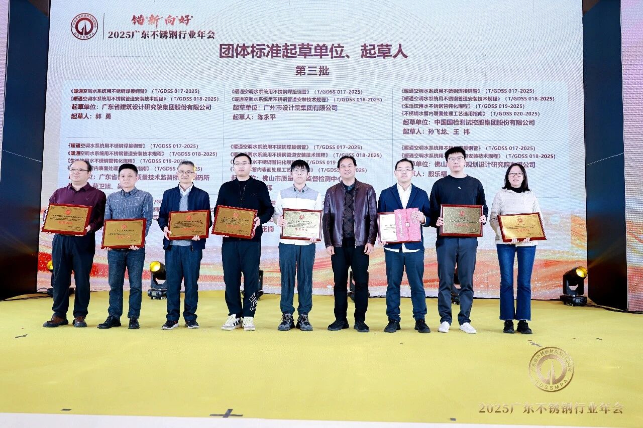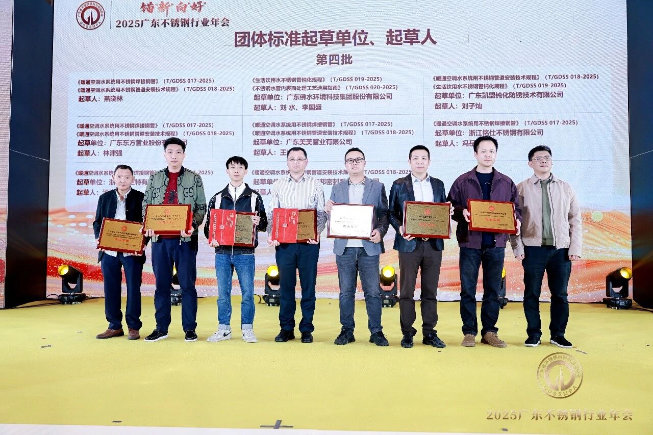2025年,广东省不锈钢材料与制品协会成功发布《暖通空调水系统用不锈钢焊接钢管》《暖通空调水系统用不锈钢管道安装技术规程》《生活饮用水不锈钢管钝化规程》《不锈钢水管表面处理工艺选用指南》等四项团体标准。大会为标准起草单位、起草人、审查人颁发牌匾及证书。
