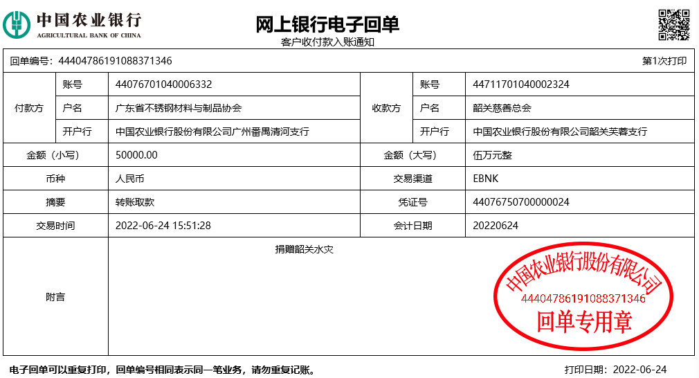 广东省不锈钢材料与制品协会为清远、韶关救灾捐款