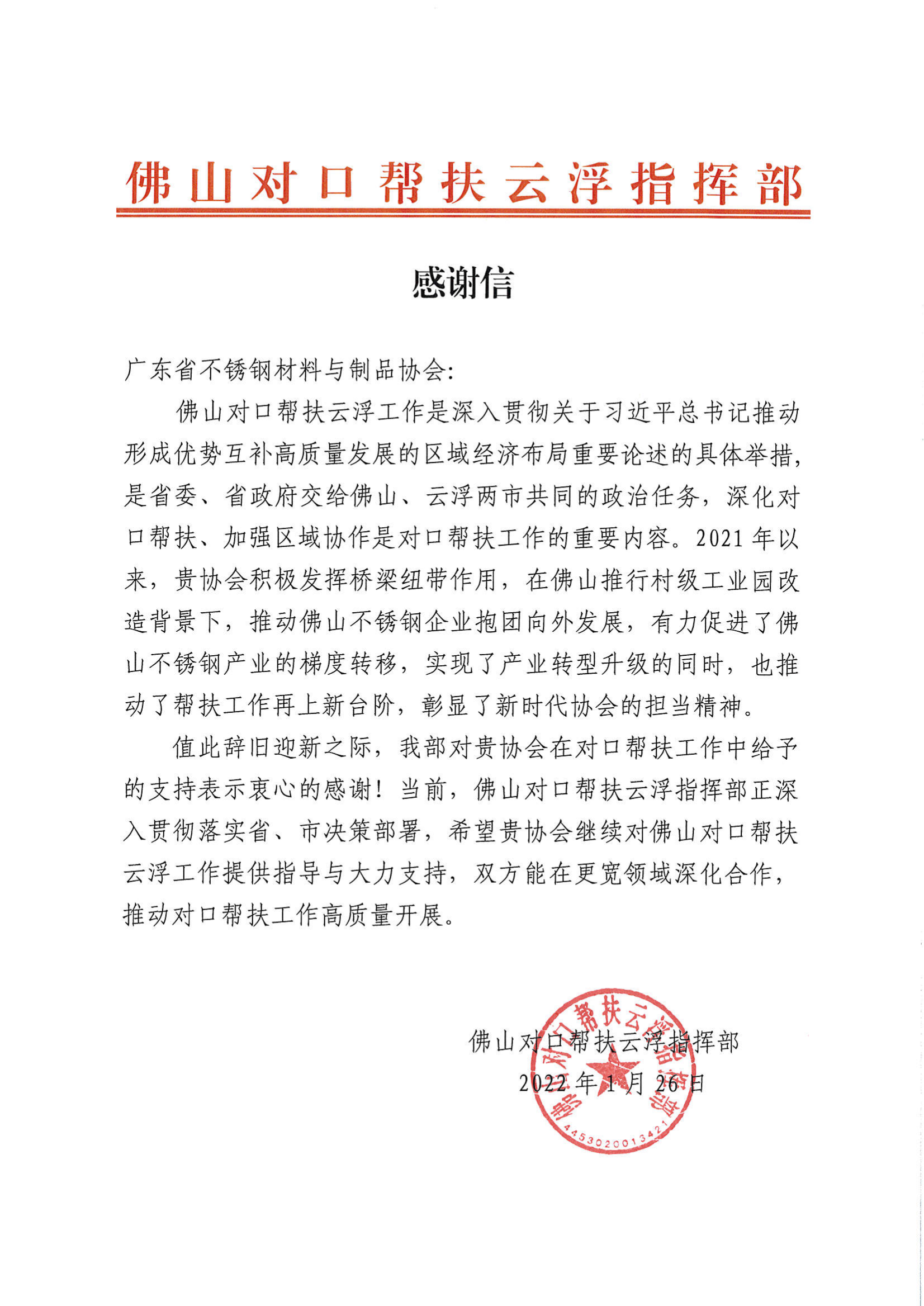 佛山对口帮扶云浮指挥部向我会发来感谢信