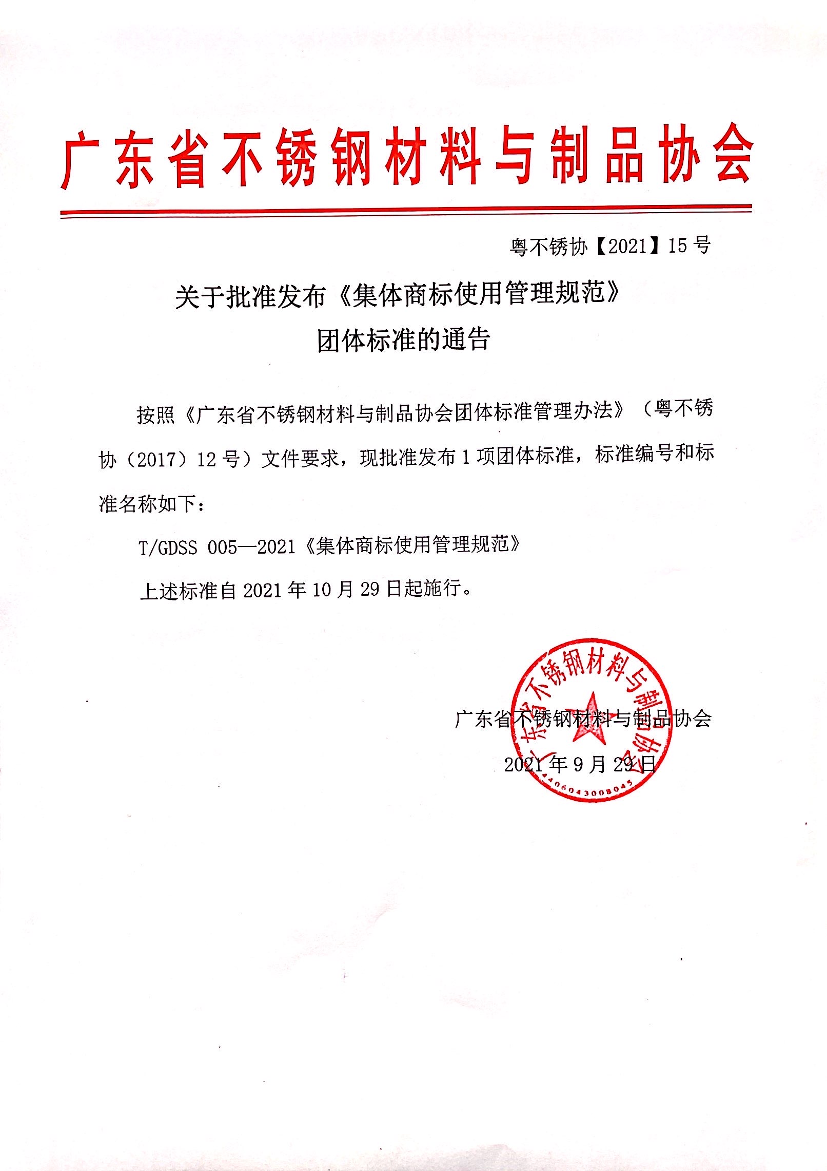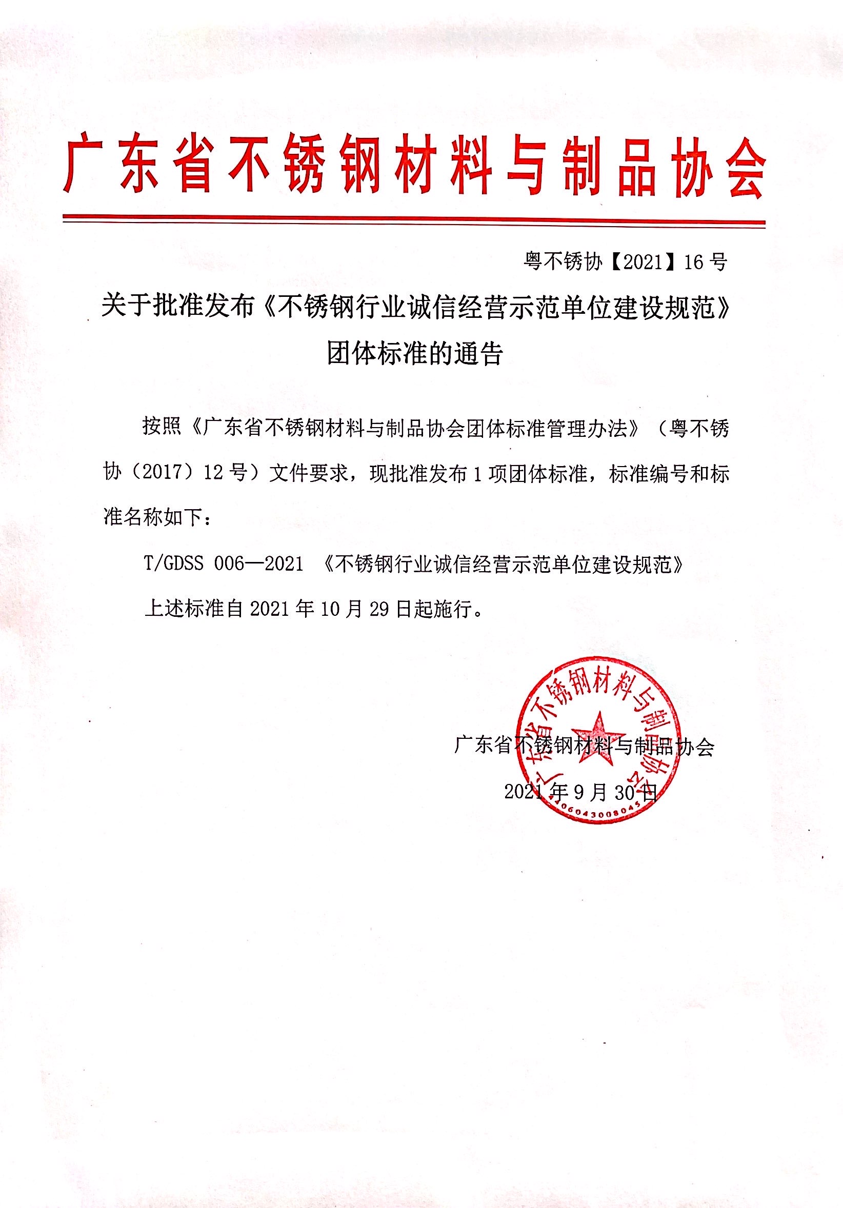广东省不锈钢材料与制品协会关于批准发布《集体商标使用管理规范》团体标准的通告按照《广东省不锈钢材料与制品协会团体标准管理办法》(粤不锈协(2017)12号)文件要求,现批准发布1项团体标准,标准编号和标准名称如下:T/GDSS ......发表于:2021-09-29