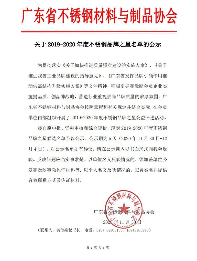 关于2019-2020年度不锈钢品牌之星名单的公示