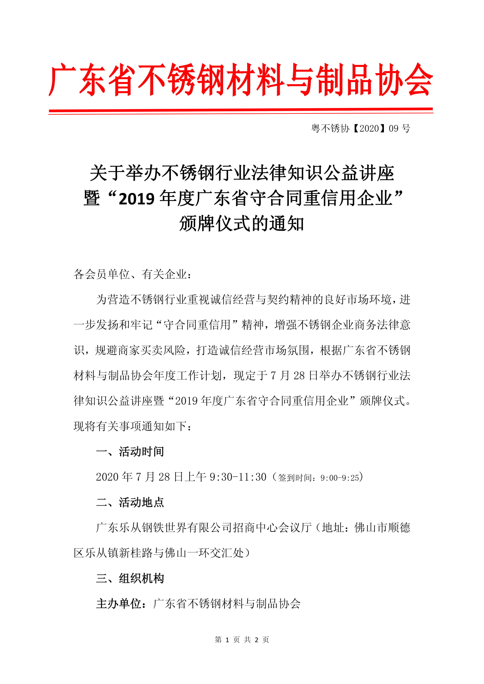 关于举办不锈钢行业法律知识公益讲座暨“2019年度广东省守合同重信用企业” 颁牌仪式的通知