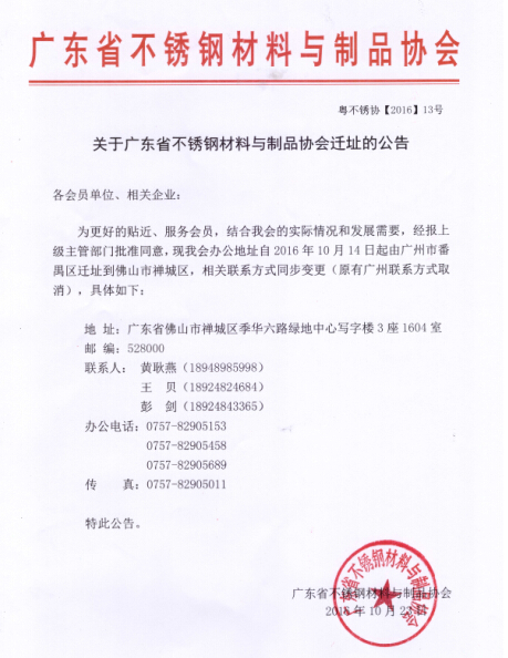 关于广东省不锈钢材料与制品协会迁址的公告各会员单位、相关企业:为更好的贴近、服务会员,结合我会的实际情况和发展需要,经报上级主管部门批准同意,现我会办公地址自2016年10月14日起由广州市番禺区迁址到佛山市禅城区,相......发表于:2016-10-24