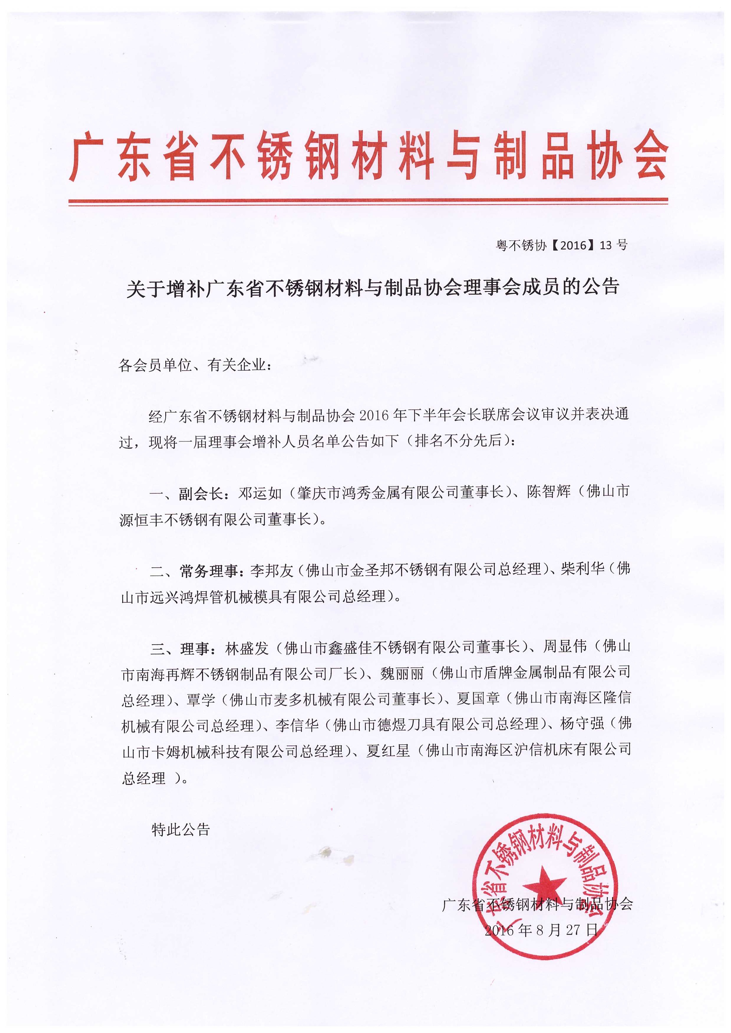 8月26日下午,根据广东省不锈钢材料与制品协会(下称我会)章程和年度工作安排,我会本年度下半年会长联席会议在佛山皇冠假日酒店举行,会长吴伟斌、监事长邢明亮、副会长叶建波、副会长梁盛基、副会长彭永红、副会长张晓敏、......发表于:2016-08-29