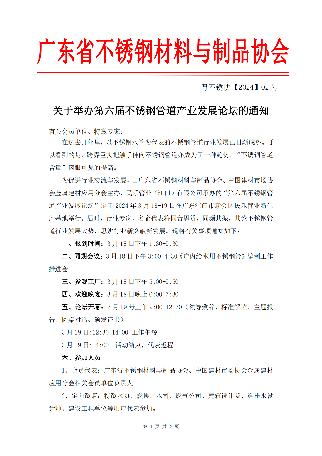 3月18日下午,广东省不锈钢材料与制品协会在常务副会长单位民乐管业江门生产基地成功召开《户内给水用不锈钢管》团体标准推进会。广东省不锈钢材料与制品协会会长林泽榆出席并致辞,著名给排水设计师、教授级高工赵力军,......发表于:2024-03-19