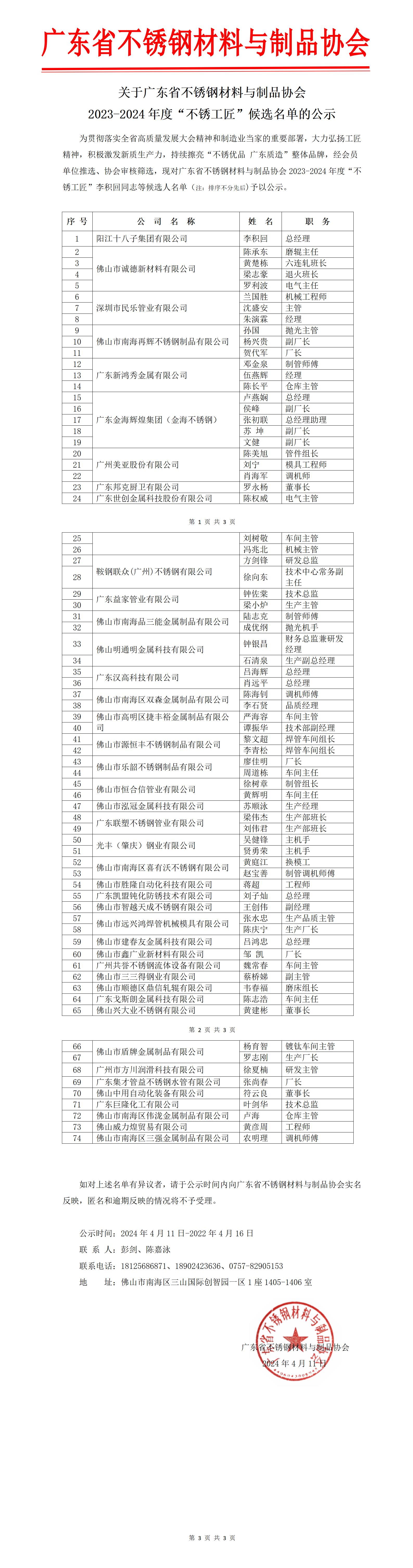 树立“不锈”榜样,弘扬“工匠”精神。4月26日上午,由广东省不锈钢材料与制品协会举办的2023-2024年度“不锈工匠”颁证仪式在佛山市南海三山国际创智园营销中心会议厅举行。本次公益活动......发表于:2024-04-28