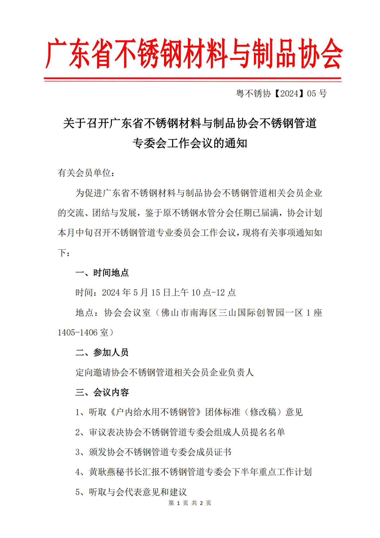 关于召开广东省不钢材料与制品协会不锈钢管道专委会工作会议的通知有关会员单位:为促进广东省不锈钢材料与制品协会不锈钢管道相关会员企业的交流、团结与发展,鉴于原不锈钢水管分会任期已届满,协会计划本月中旬召开不锈......发表于:2024-05-08