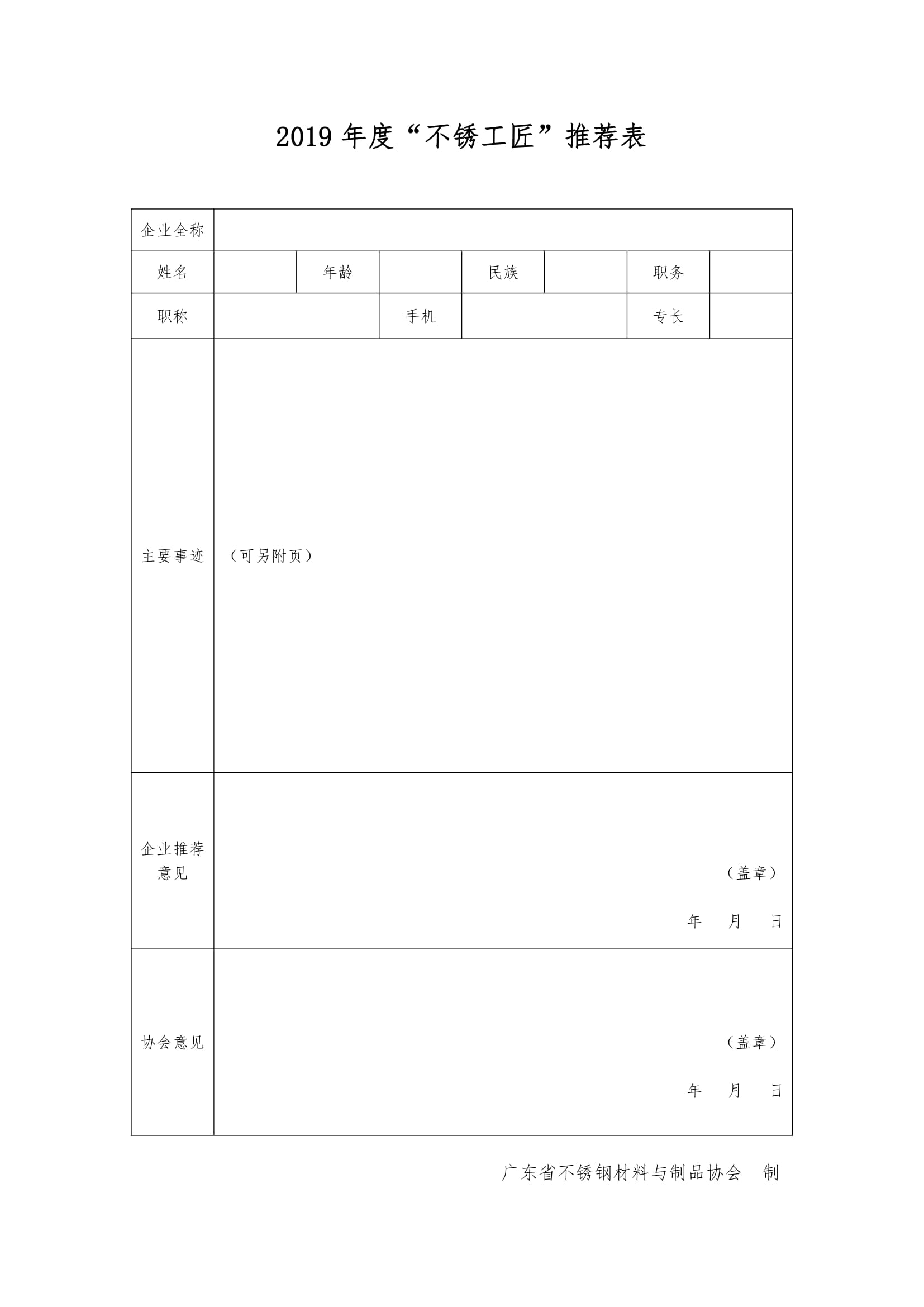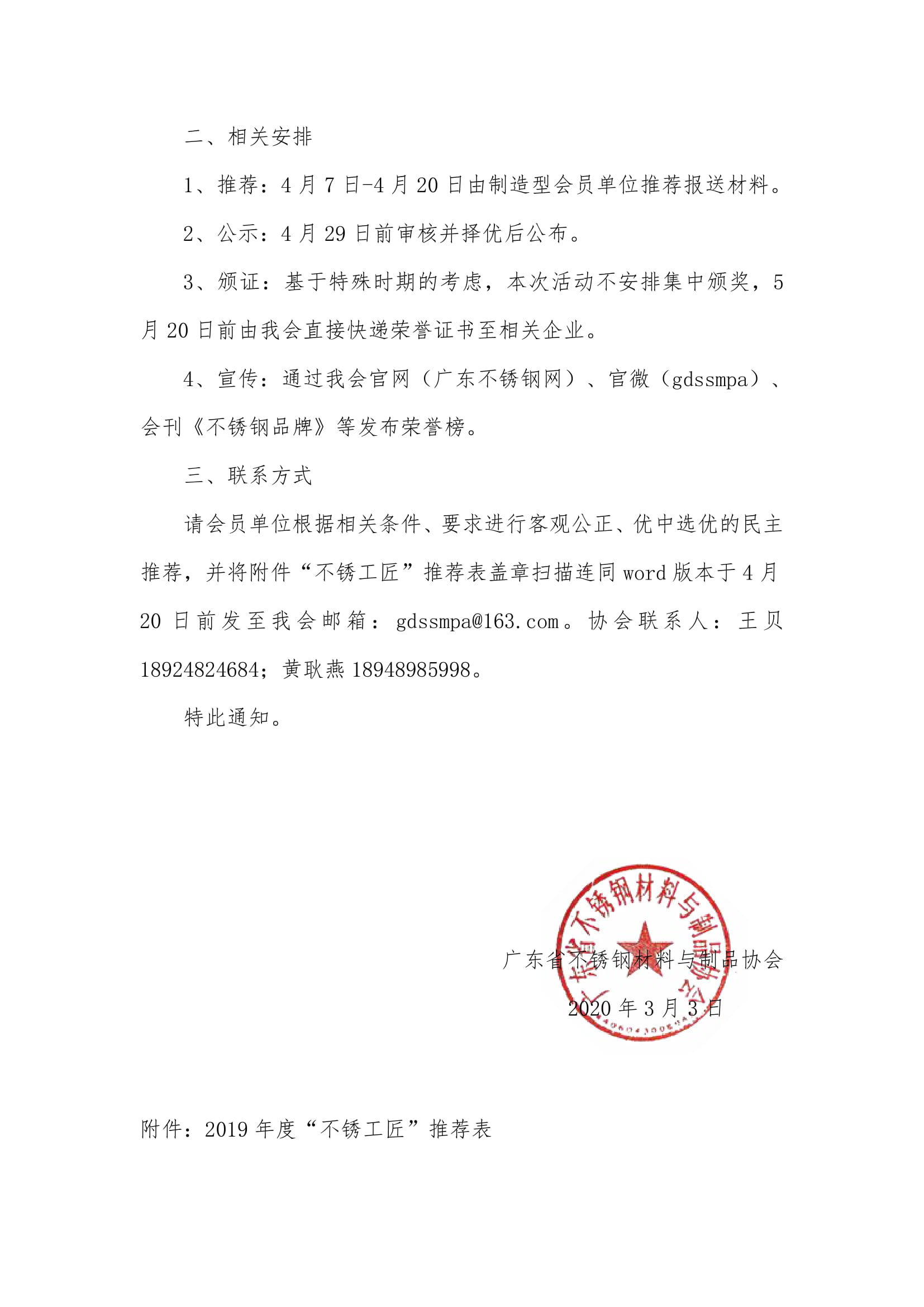 请会员单位根据相关条件、要求进行客观公正、优中选优的民主推荐,并将附件“不锈工匠”推荐表盖章扫描连同word版本于4月20日前发至我会邮箱:[email protected]。协会联系人:王贝18924824684;黄耿燕18948985998。