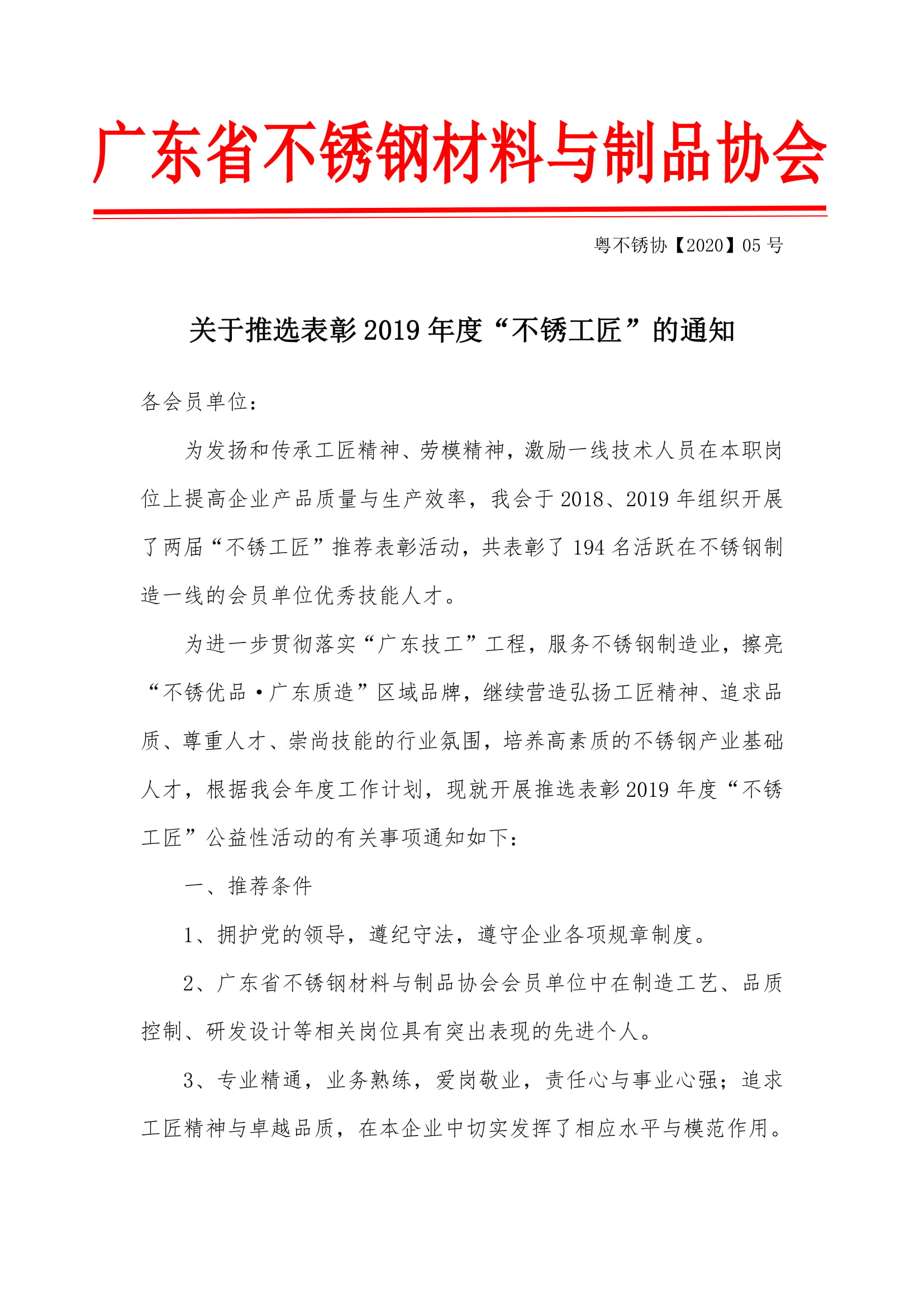 为进一步贯彻落实“广东技工”工程,服务不锈钢制造业,擦亮“不锈优品·广东质造”区域品牌,继续营造弘扬工匠精神、追求品质、尊重人才、崇尚技能的行业氛围,培养高素质的不锈钢产业基础人才,根据我会年度工作计划,现就开展推选表彰2019年度“不锈工匠”公益性活动的有关事项通知如下:
