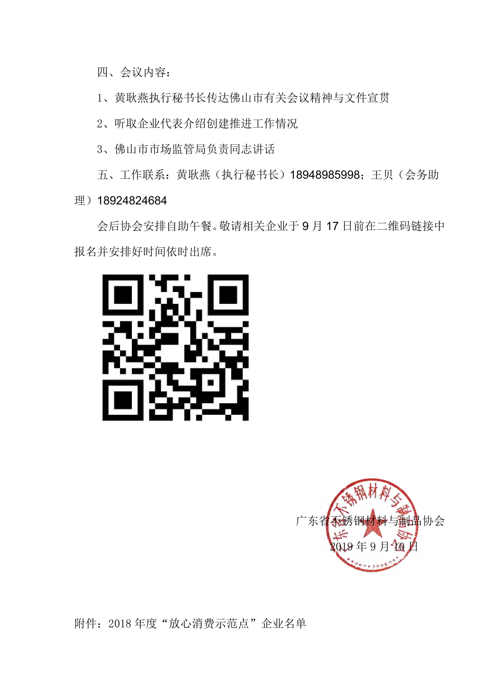 2018年,经佛山市放心消费城市创建工作领导小组办公室、佛山市政府主管部门考察审核和第三方机构评估验收及征求意见、社会公示等程序,广东省不锈钢材料与制品协会荣获首批佛山市放心消费示范行业协会称号,24家佛山市会员企业则被授予为2018年度放心消费示范点称号。根据创建工作要求并结合我会实际,拟定于近期召开2019年度不锈钢行业佛山市放心消费示范点创建推进座谈会,现将有关事项通知如下: