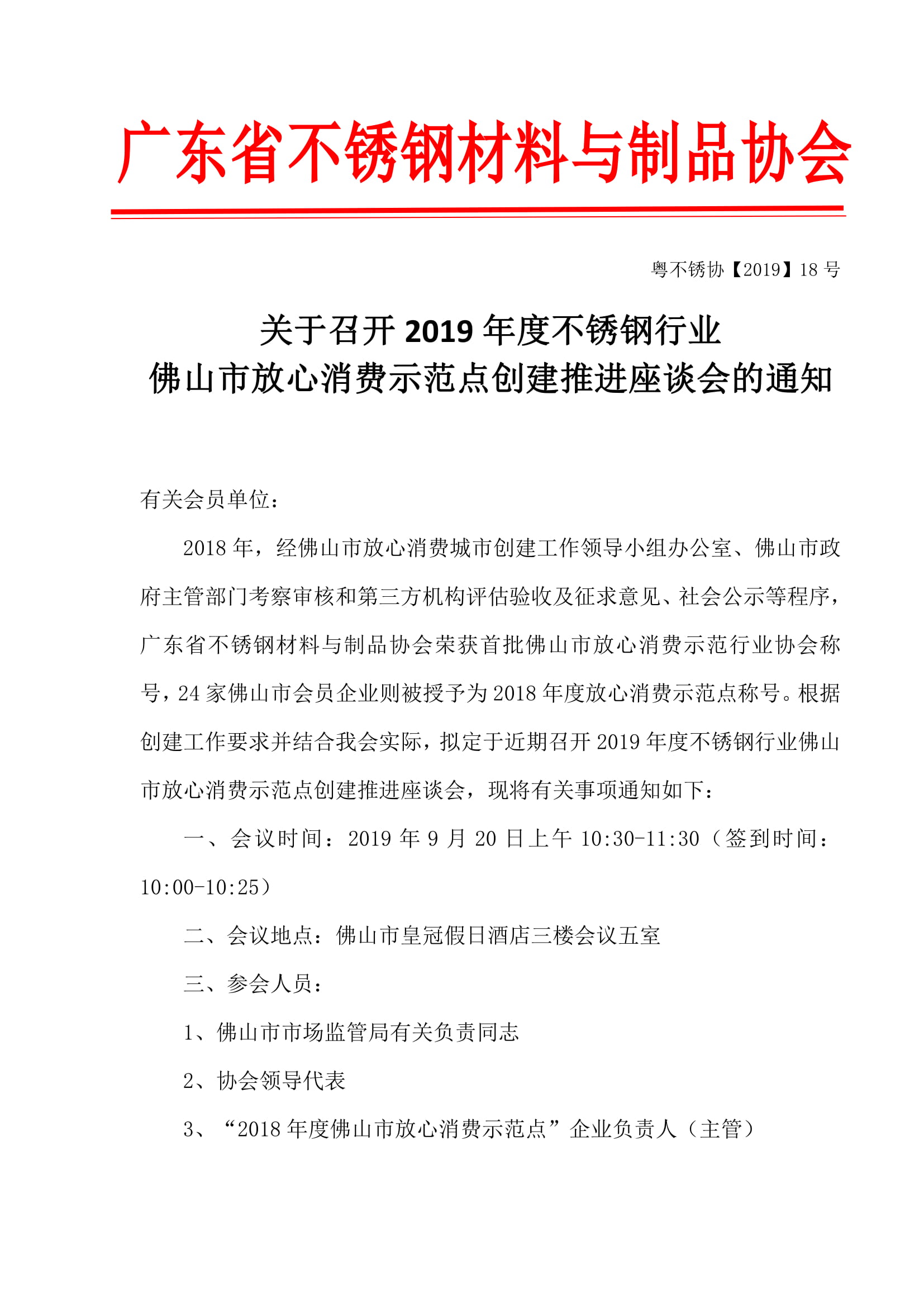 关于召开2019年度不锈钢行业佛山市放心消费示范点创建推进座谈会的通知