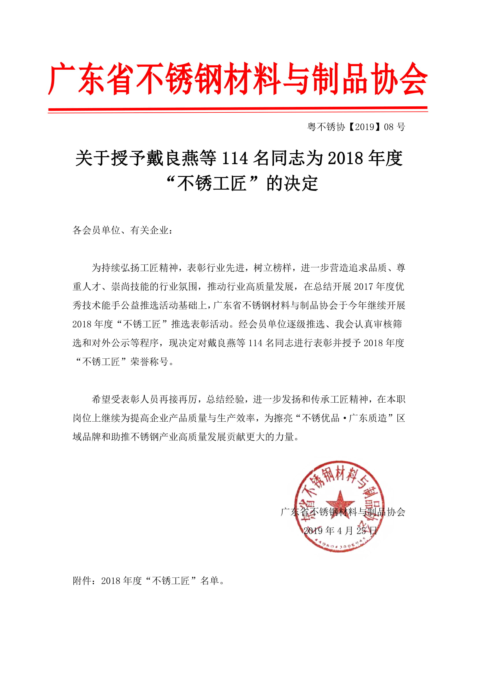 关于授予戴良燕等114名同志为2018年度“不锈工匠”的决定