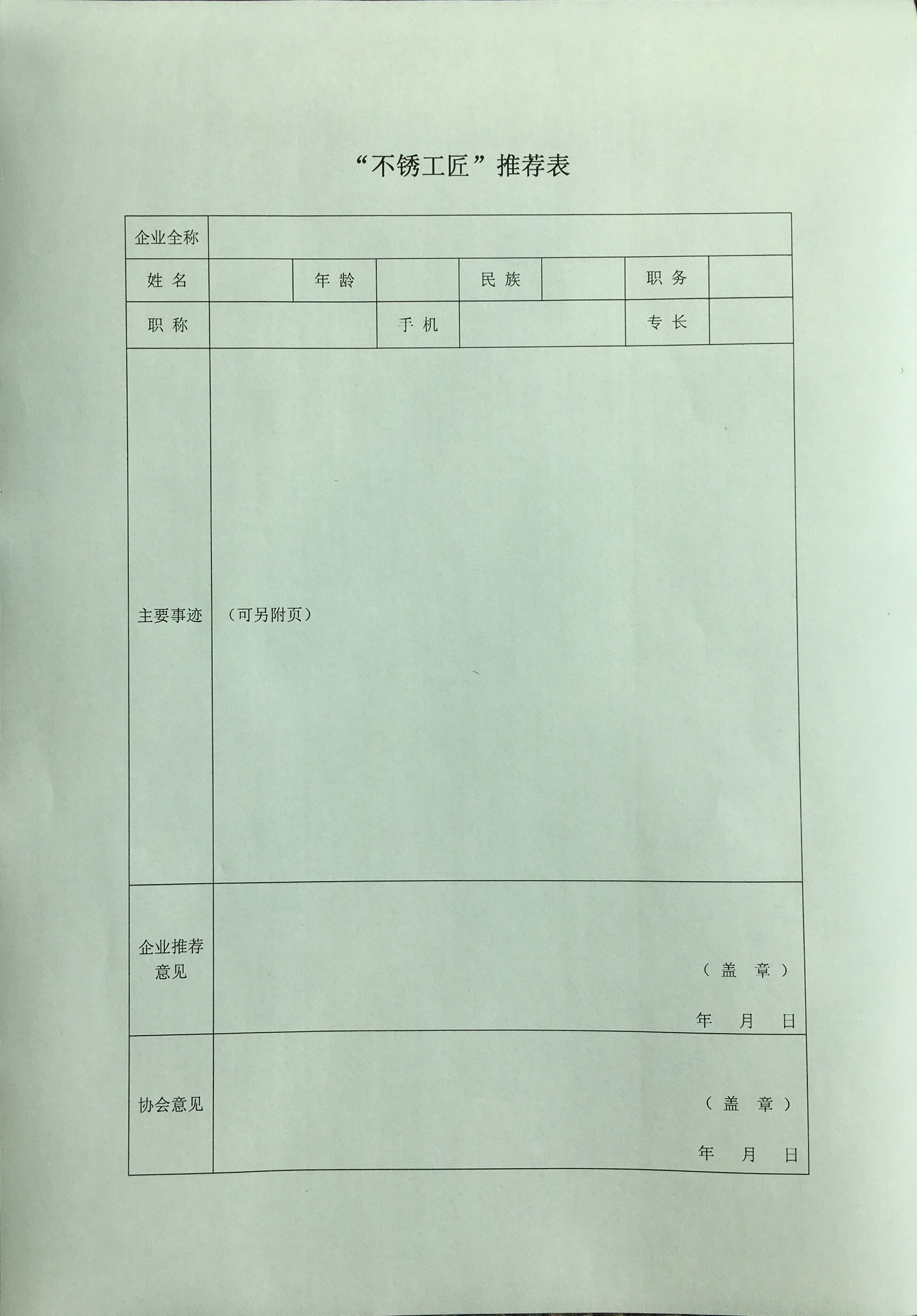 请会员单位根据相关条件、要求进行客观公正、优中选优的推荐,并将附件“不锈工匠”推荐表盖章扫描于4月13日前发至我会邮箱:[email protected]。协会联系人:王贝(会务助理);0757-82905153、18924824684;黄耿燕(执行秘书长):18948985998。