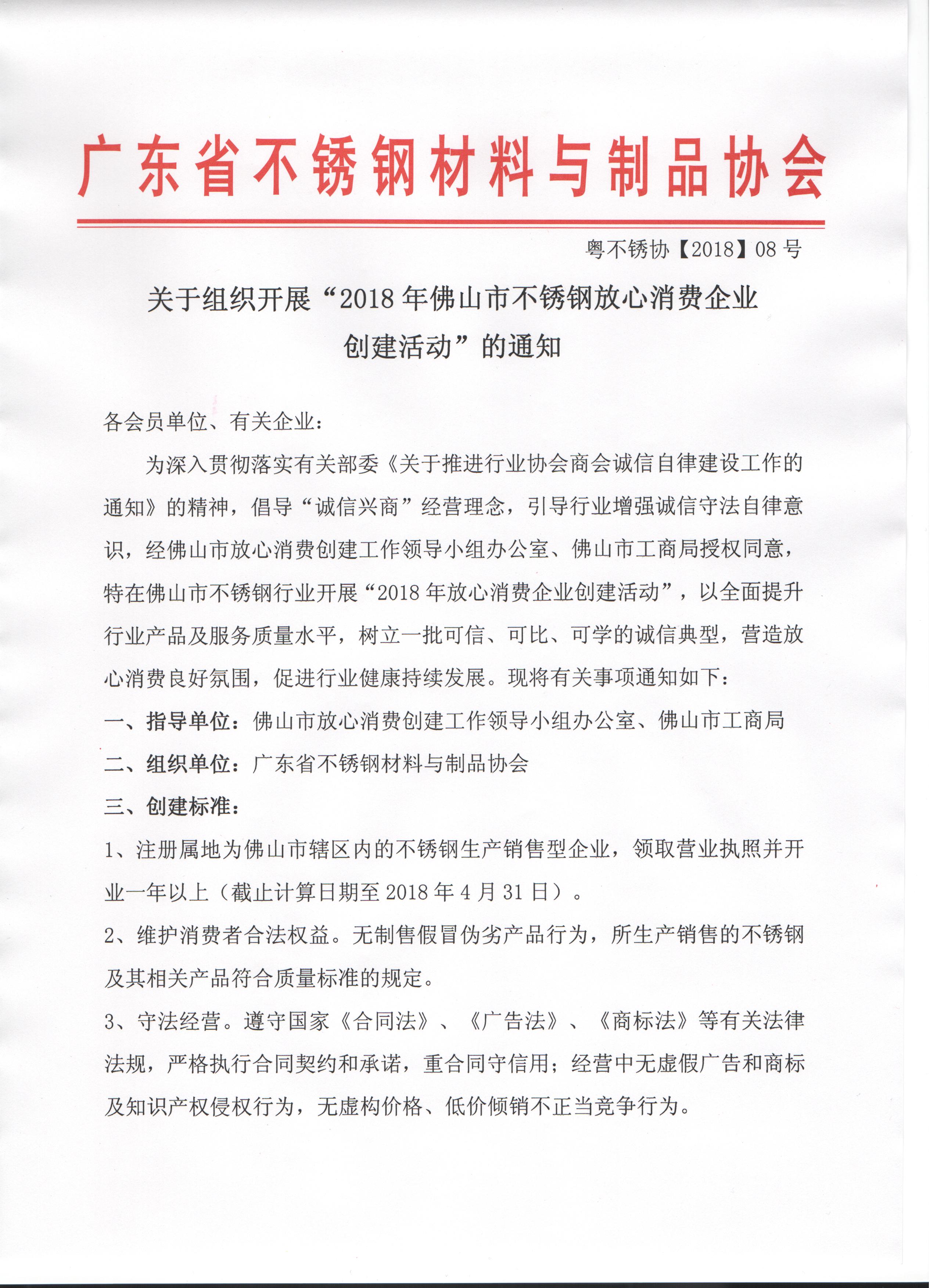 关于组织开展“2018年佛山市不锈钢放心消费企业创建活动”的通知
