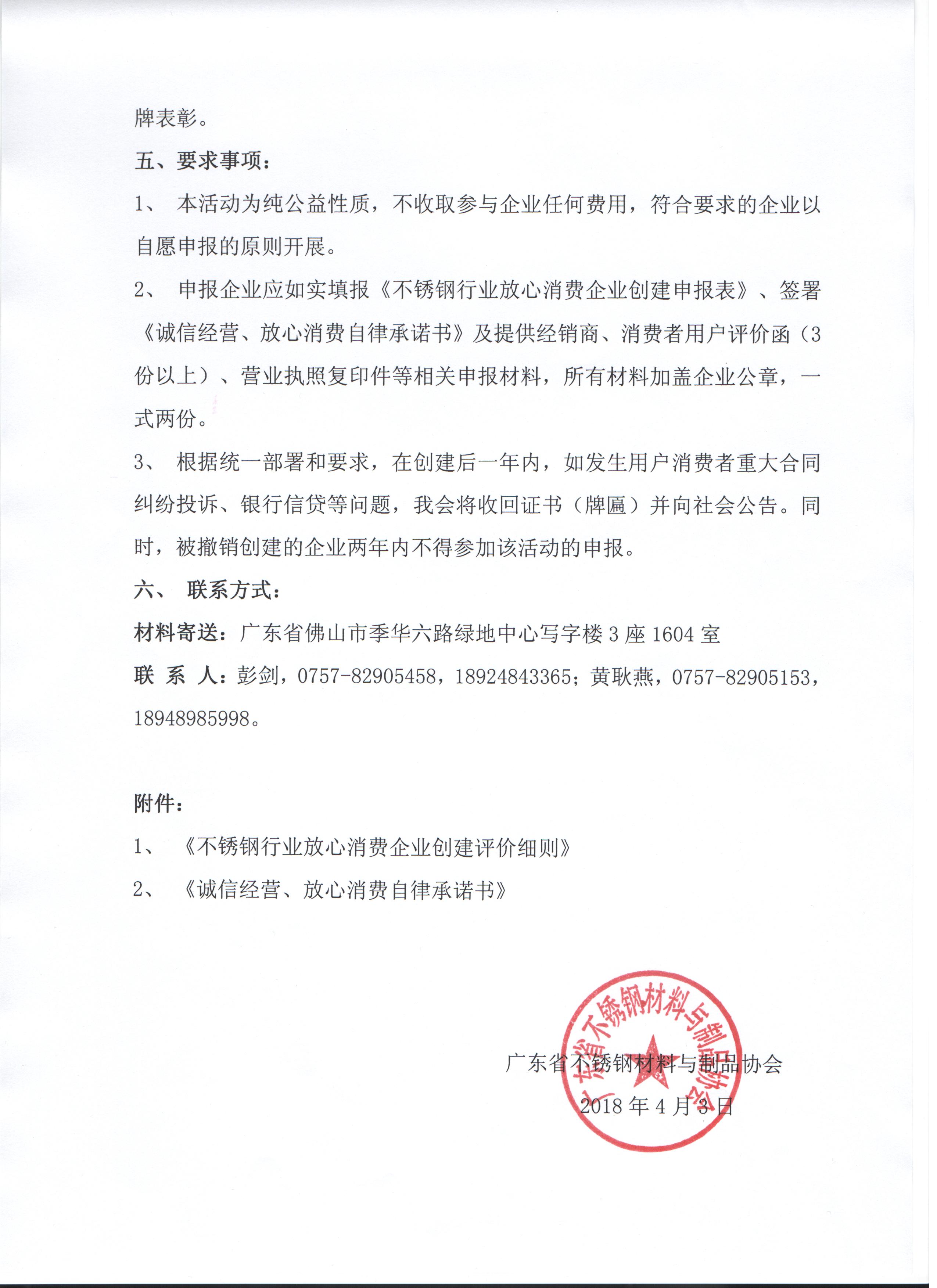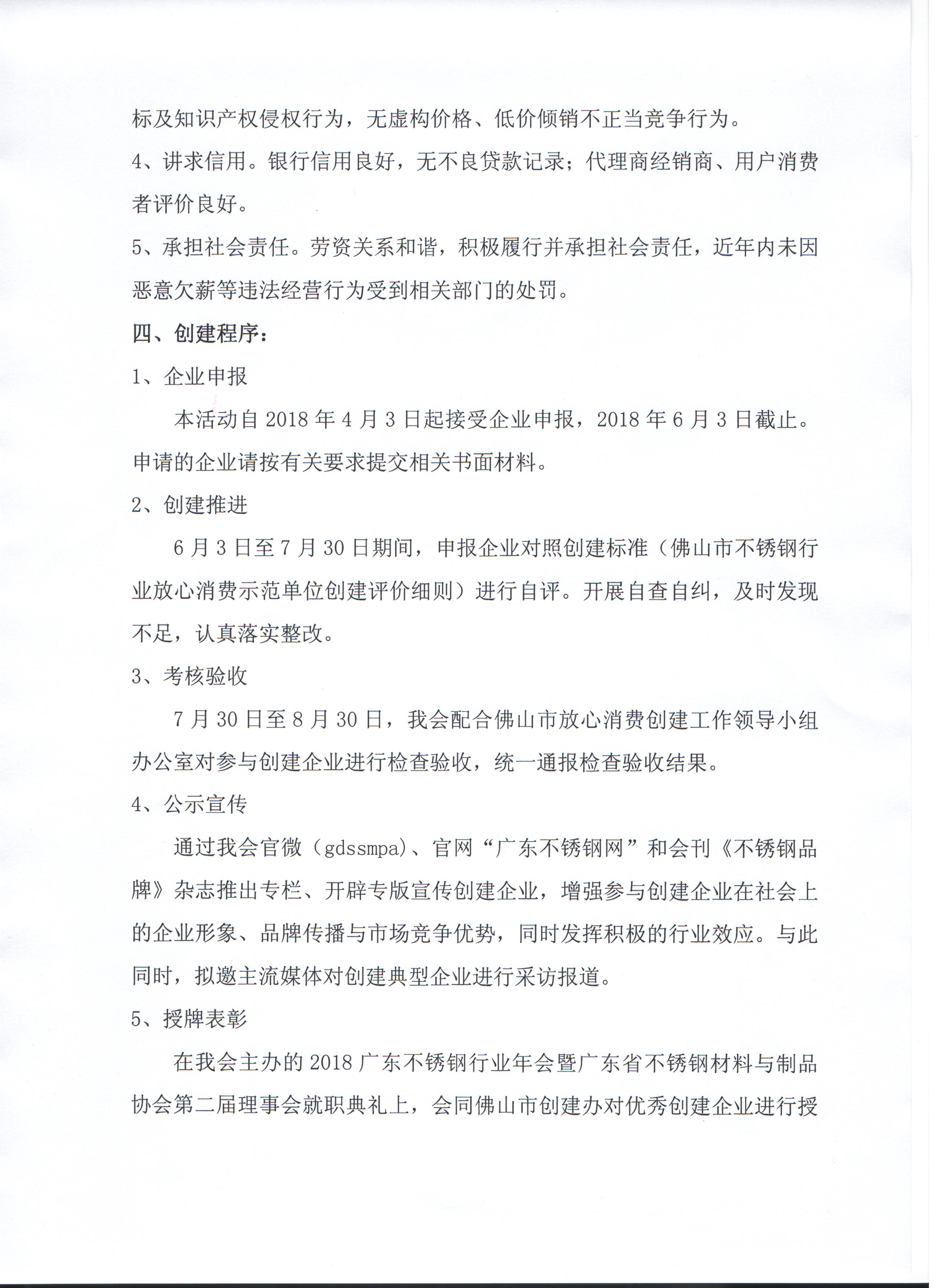 为深入贯彻落实有关部委《关于推进行业协会商会诚信自律建设工作的通知》的精神,倡导“诚信兴商”经营理念,引导行业增强诚信守法自律意识,经佛山市放心消费创建工作领导小组办公室、佛山市工商局授权同意,特在佛山市不锈钢行业开展“2018年放心消费企业创建活动”,以全面提升行业产品及服务质量水平,树立一批可信、可比、可学的诚信典型,营造放心消费良好氛围,促进行业健康持续发展。现将有关事项通知如下: