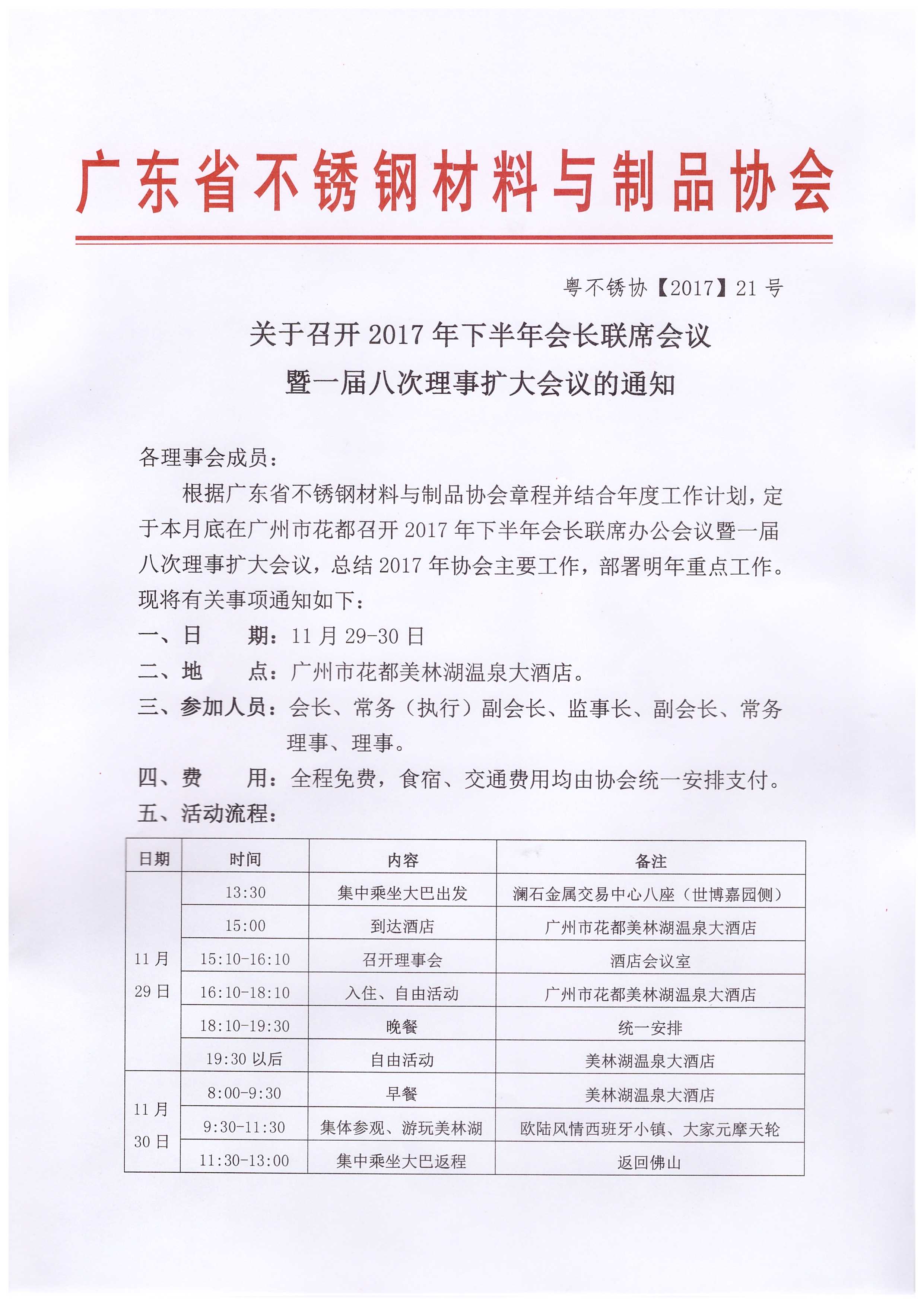 根据广东省不锈钢材料与制品协会章程并结合年度工作计划,定于本月底在广州市花都召开2017年下半年会长联席办公会议暨一届八次理事扩大会议,总结2017年协会主要工作,部署明年重点工作。现将有关事项通知如下: