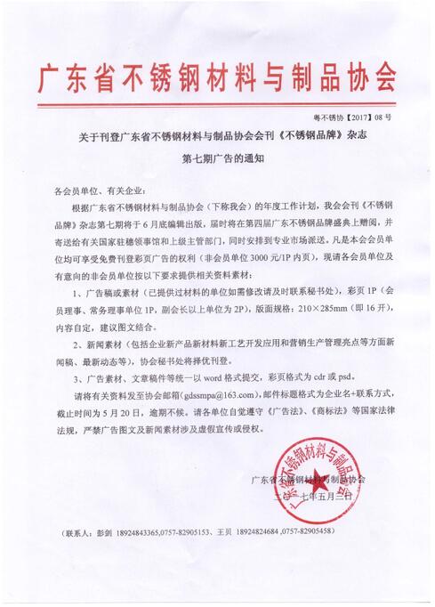 关于刊登广东省不锈钢材料与制品协会会刊《不锈钢品牌》杂志