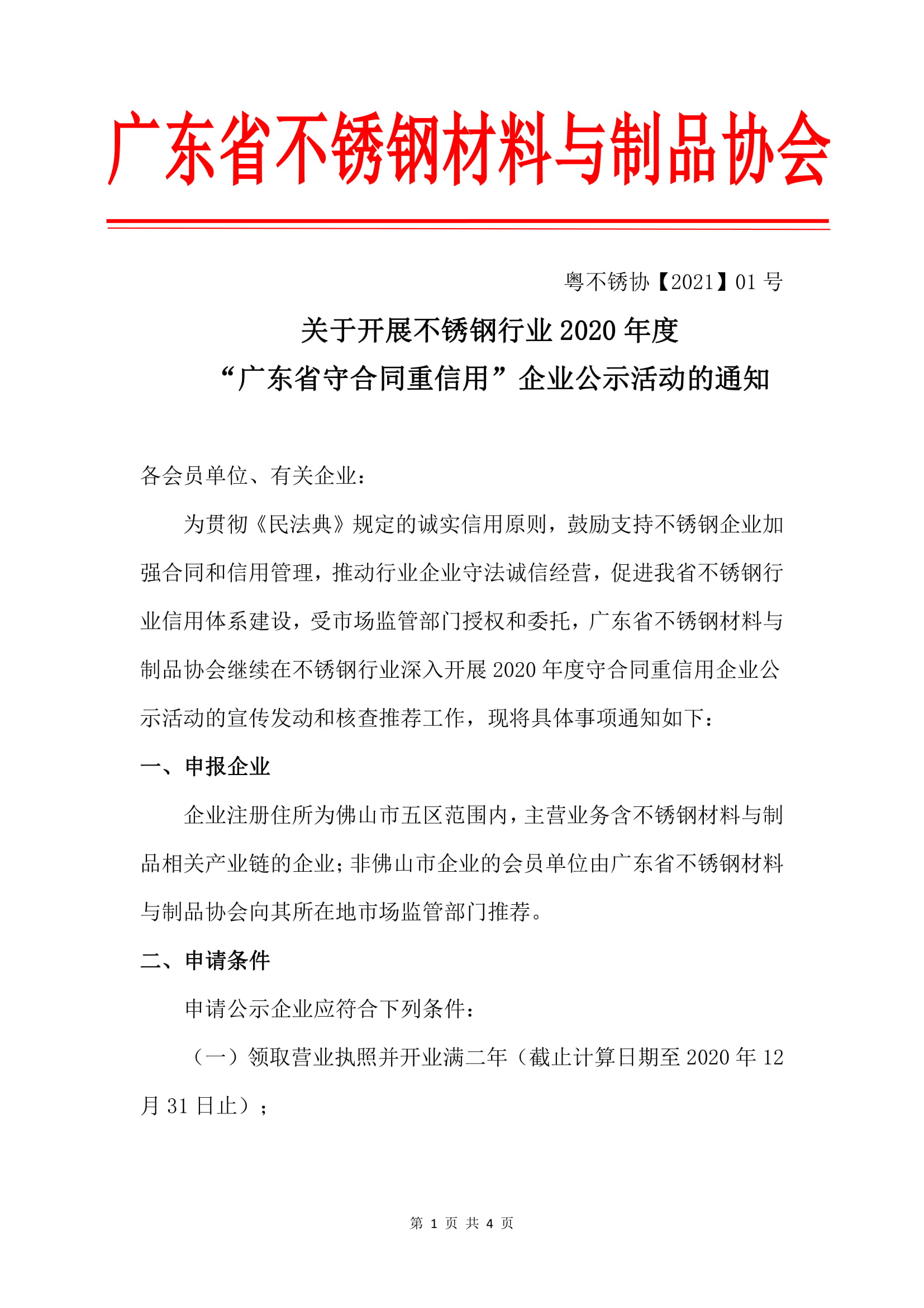 为贯彻《民法典》规定的诚实信用原则,鼓励支持不锈钢企业加强合同和信用管理,推动行业企业守法诚信经营,促进我省不锈钢行业信用体系建设,受市场监管部门授权和委托,广东省不锈钢材料与制品协会继续在不锈钢行业深入开展2020年度守合同重信用企业公示活动的宣传发动和核查推荐工作,现将具体事项通知如下: