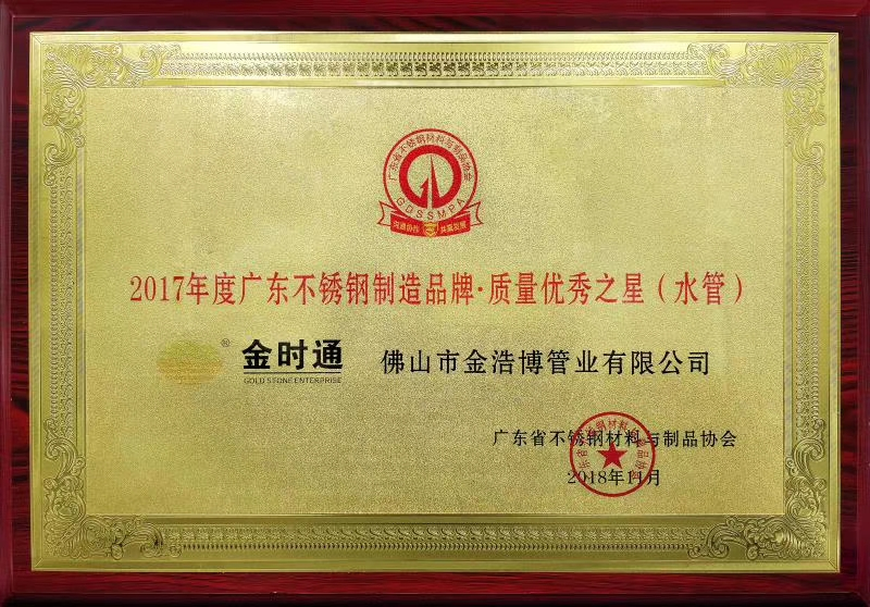 金浩博企业属下“金时通”品牌,以品质为己任、以客户为中心,打造“一次选择一生管用”的质量诉求。产品得到同行业以及各个专业领域、渠道项目的认可。薄壁不锈钢管材、管件产品拥有全国行业为数不多的“中华人民共和国特种设备制造许可证”(压力管道证)和“特种设备型式检验证书”。近年来更参与制定、起草广东省不锈钢材料与制品协会《不锈钢管及卡压式管件团体标准》T/GDSS002-2018、中国工程建设协会标准《建筑给排水薄壁不锈钢管连接技术规程》,并相继荣获“全国工业产品生产许可证”、“安全生产标准化证书”“CCTV-7品牌展播企业”、“守合同重信用企业”“广东不锈钢制造品牌.质量之星企业”、佛山市“专精特新”企业等荣誉。所有这些荣誉嘉许,是对金浩博企业19年匠心精神的支持和肯定。