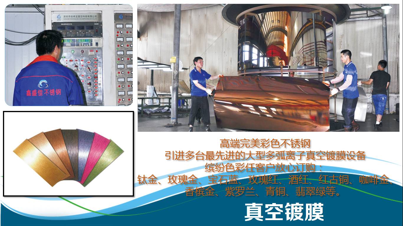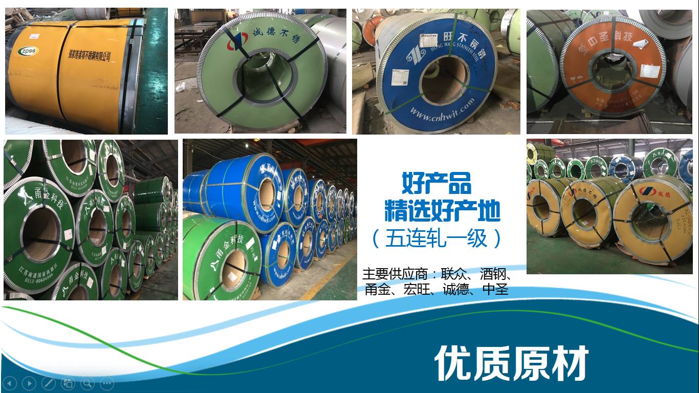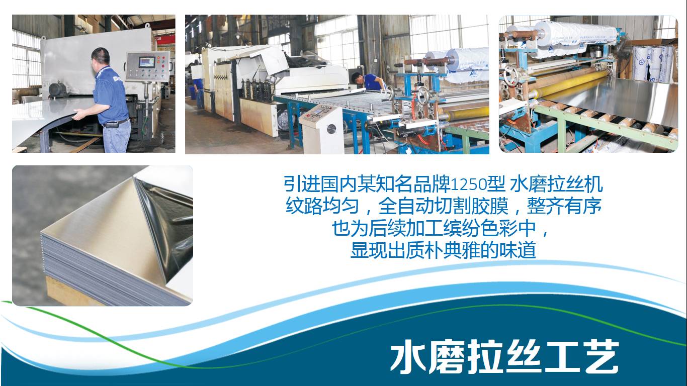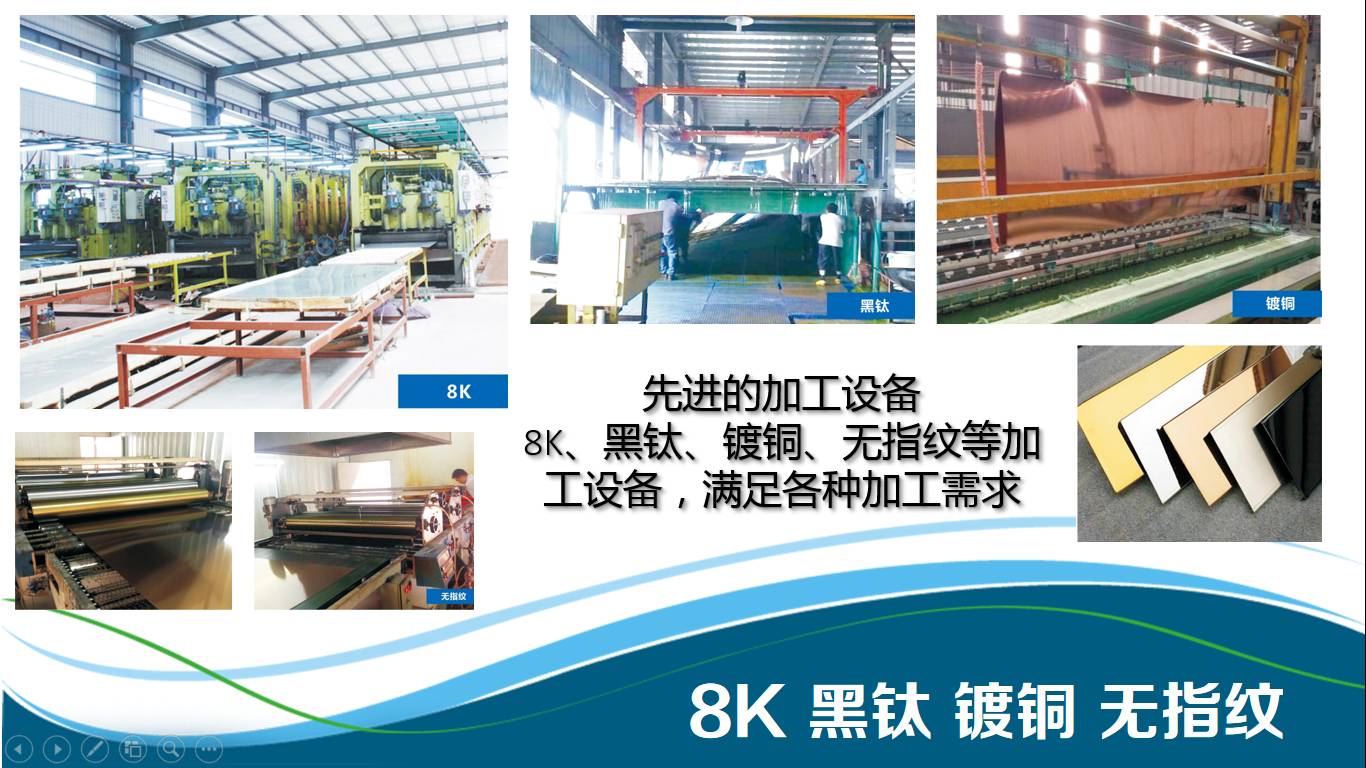 该公司主要销售:304、202、201、430不锈钢系列,以及8K、钛金、钛黑、雪花砂、砂面、蚀花板等表面加工。其致力于生产设备的更新与升级,具有精密的制作工艺。凭着优秀的品质,合理的价格,赢得了国内外众多客商的一致好评,产品远销至东南亚等国家和地区,并建立了与国际贸易商长期的合作关系。