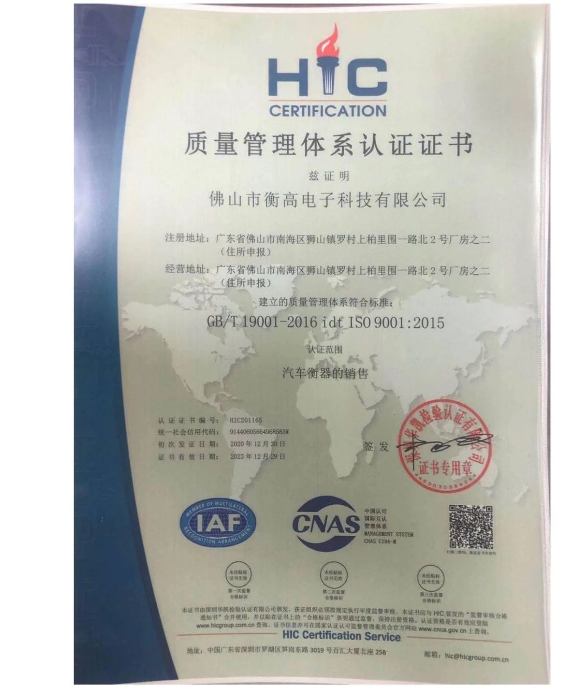 2020年12月佛山市衡高电子科技有限公司通过1S09001质量管理体系认证。