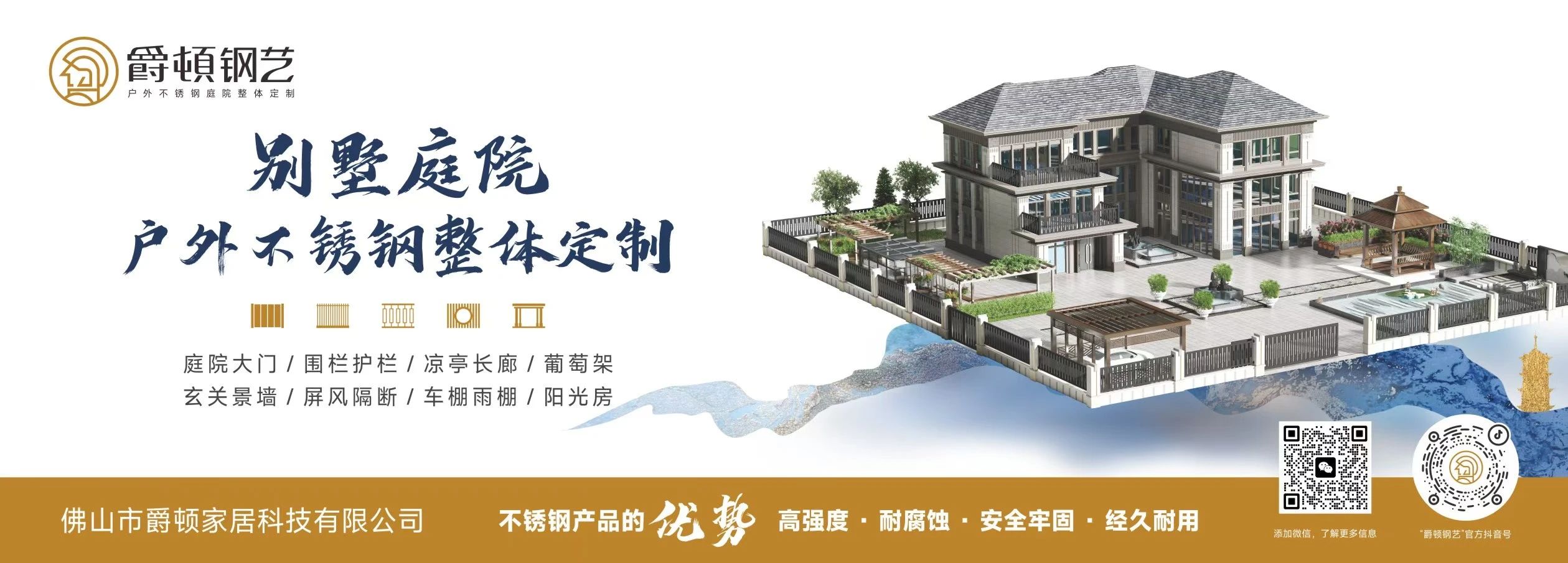 佛山市爵顿家居科技有限公司是广东省不锈钢材料与制品协会理事单位,位于中国不锈钢之都广东佛山,专注于对不锈钢管材的表面处理、深加工和成品应用的创新,推动了传统不锈钢管材,从平面管到各种压花管;从不锈钢本色到色彩丰富的镀钛色、烤漆色,木纹色等;从传统领域的应用,到别墅庭院不锈钢整体定制的华丽转身,完成了对不锈钢管的重新定义,从钢管到钢艺的完美升级。目前,爵顿已拥有从制管、管板深加工和表面处理的产业链布局,打造了户外不锈钢产品整体配套和定制。
