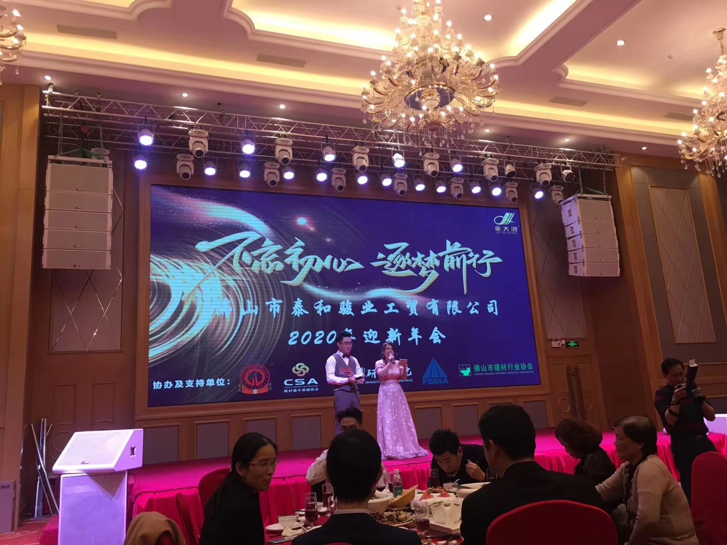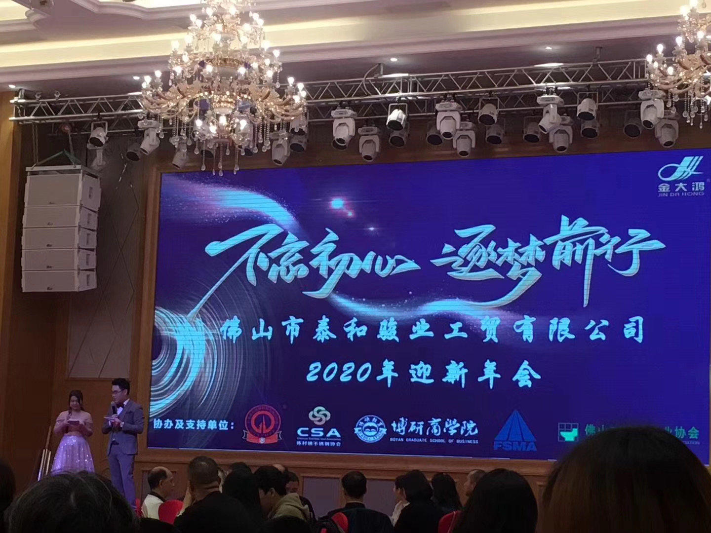 1月2日晚,“不忘初心 逐梦前行”-佛山市泰和骏业工贸有限公司2020迎春年会在佛山市顺德区陈村维也纳酒店隆重举行。广东省不锈钢材料与制品协会副会长、泰和骏业董事长袁伟明与全体员工共聚一堂、共迎新春。广东省不锈钢材料与制品协会常务副会长、万佳泓董事长(兼任陈村镇不锈钢协会会长)杜海波先生等一众业界嘉宾到会祝贺。