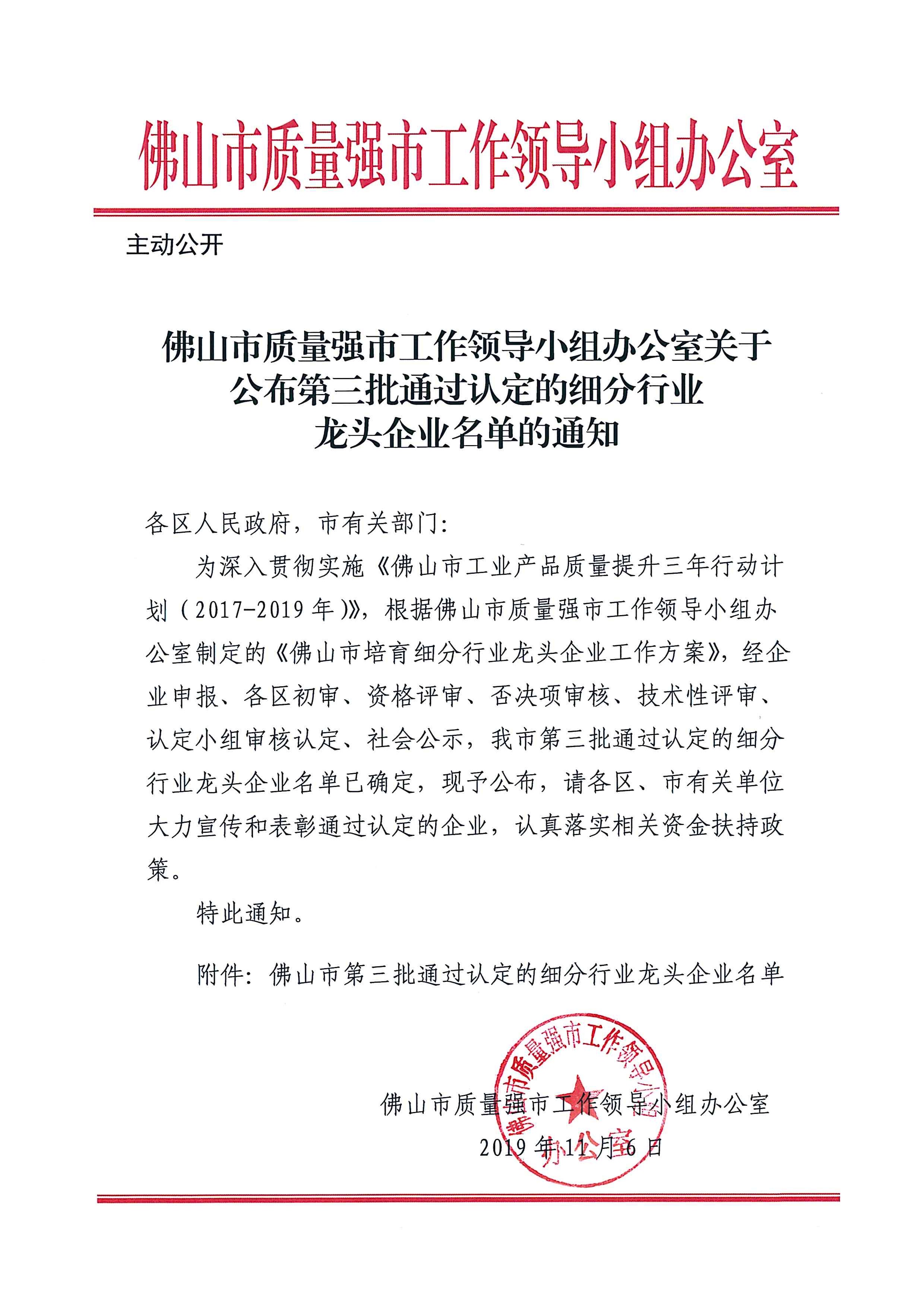 据悉,佛山市细分行业龙头企业系由政府牵头组织认定的重要奖项,其工作小组成员单位包括佛山市市场监管局、佛山市工商联、佛山市科技局、佛山市工信局,办事机构设在佛山市市场监管局。