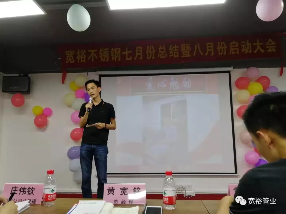 宽裕是一个让我们不断成长的舞台,我们每天不是在奋斗的路上就是在准备奋斗的路上,做得好的地方我们要总结好的方法,做得不好的地方我们要总结失败的经验。我们荣幸邀请到宽裕不锈钢销售部毛经理为我们做7月份工作总结和8月份展望。