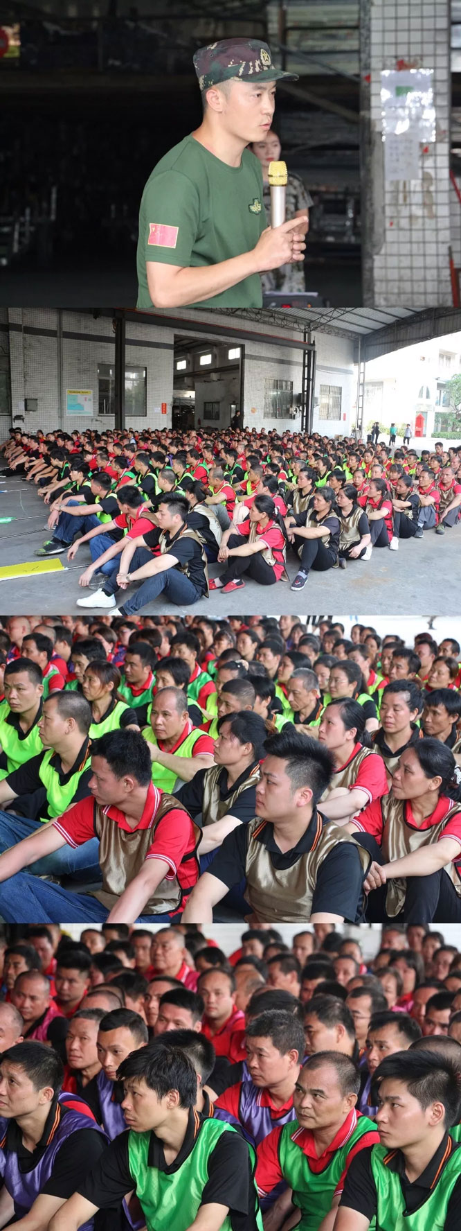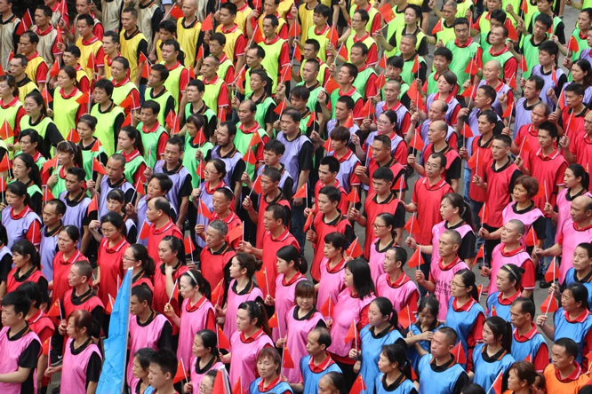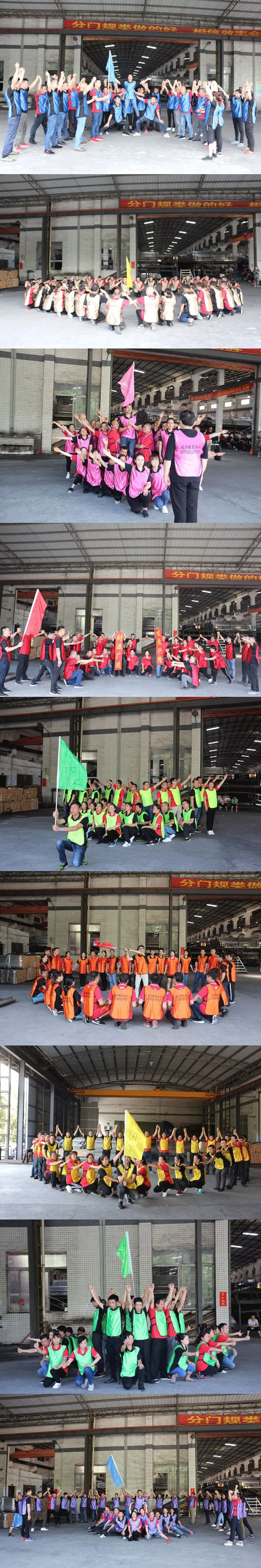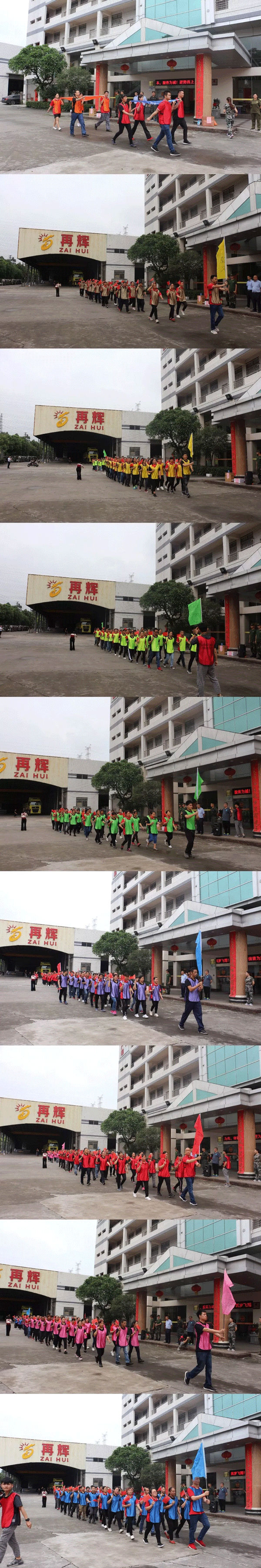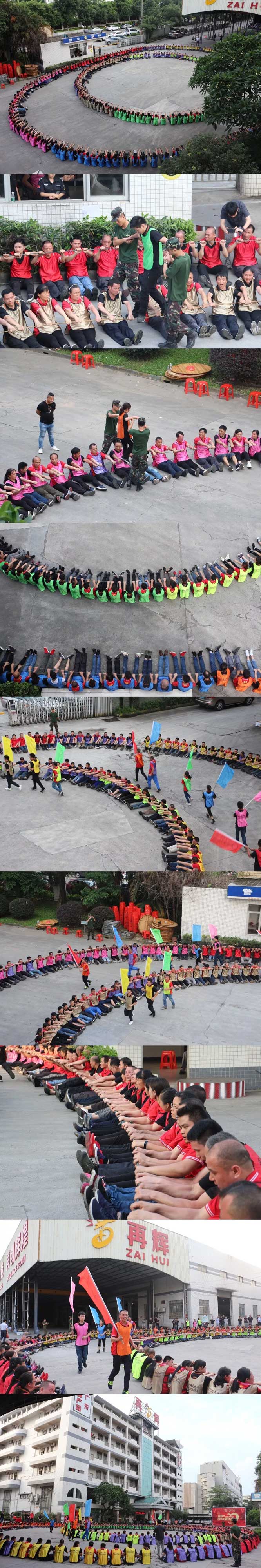 参加此次特训的再辉、瑜顺公司员工近400人。早上6点多钟,已经开始初步集训,每一位员工展现出士气十足,精神抖擞、斗志昂扬。一共九支队伍,分别有领队、旗手、战队名称、队服、口号、队歌等。上午9:15,在鼓舞激昴的音乐中整装有序、隆重出场。