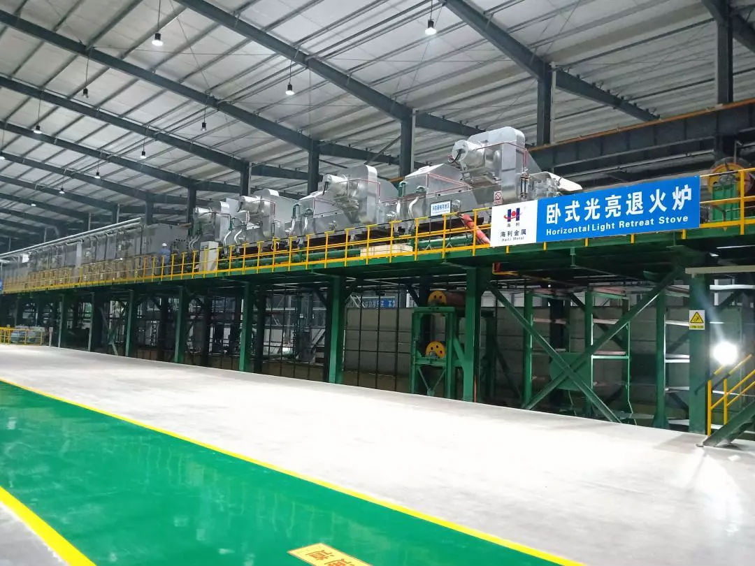 该生产线是我会副会长单位广东世创科技为江西海利量身打造的升级版10万吨级1350mm不锈钢冷轧带连续卧式光亮退火生产线,该产线最大可退1350mm不锈钢带,厚度范围0.25-2.0mm,配备在线脱脂,入口、出口活套,可实现日产超300吨的不锈钢光亮连续退火加工能力。