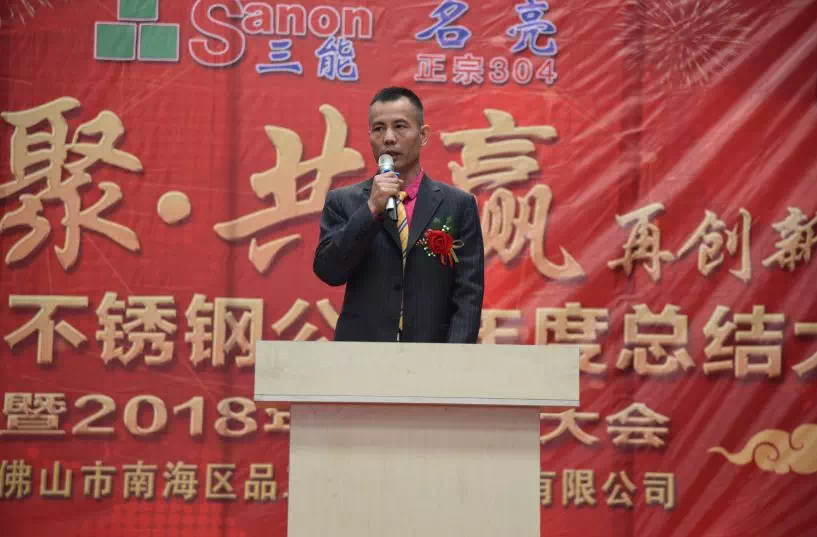 昨日(1月14日)下午,广东省不锈钢材料与制品协会(下称我会)会员单位佛山市南海区品三能不锈钢制品有限公司在其厂区内隆重举行2017年终总结大会暨经销商大会,来自全国各地的三能不锈钢经销商、供应商代表及员工代表近300多人参加。应曾少亮董事长的邀请,我会专职执行副会长兼秘书长林泽榆出席并致辞。