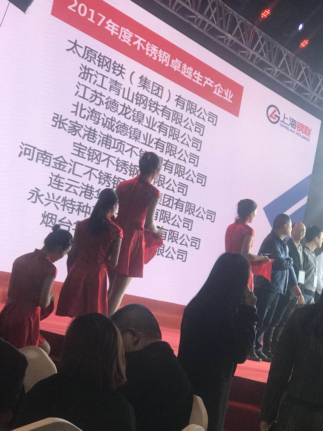 16日当晚,大会举行了相关颁奖仪式。太钢、宝钢不锈、北海诚德、浙江青山钢铁、河南金汇等钢厂荣获2017年度中国不锈钢卓越生产企业奖。光丰钢业集团则获得组委会颁发的2017年度中国钢贸企业百强奖并入围2017年度综合榜,詹洁容女士代表光丰集团上台领奖。